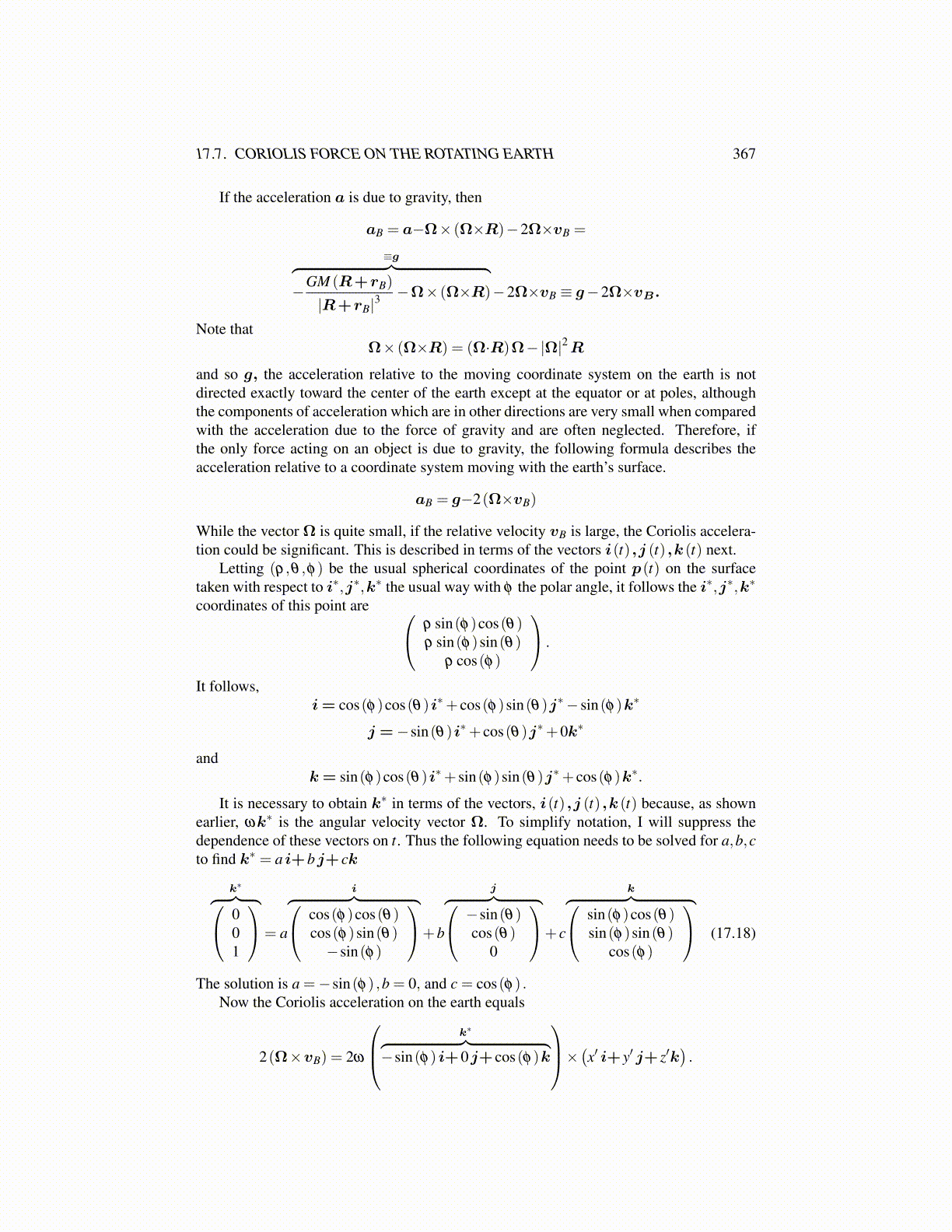 It is clear from experiments with the pendulum that the earth does indeed rotate out fromunder it causing the plane of vibration of the pendulum to appear to rotate. The purposeof this discussion is not to establish this obvious fact but to predict how long it takes forthe plane of vibration to make one revolution. There will be some instant in time at whichthe pendulum will be vibrating in a plane determined by k and j. (Recall k points awayfrom the center of the earth and j points East. ) At this instant in time, defined as t = 0,