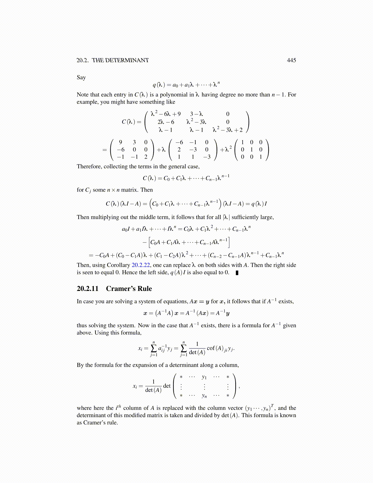 which results from formally expanding along the top row. Note you would get the samething expanding along the last column because as just noted, the last column on the rightis 0 except for the top entry, so every cofactor A1k for the 1kth position is ± a determinantwhich has a column of zeros. Thus N is a multiple of wp. Hence, for j < p,N ·u j = 0.From what was just discussed and induction, v(P(u1, · · · ,up−1)) =±A1p =N ·wp. AlsoN ·up equals
