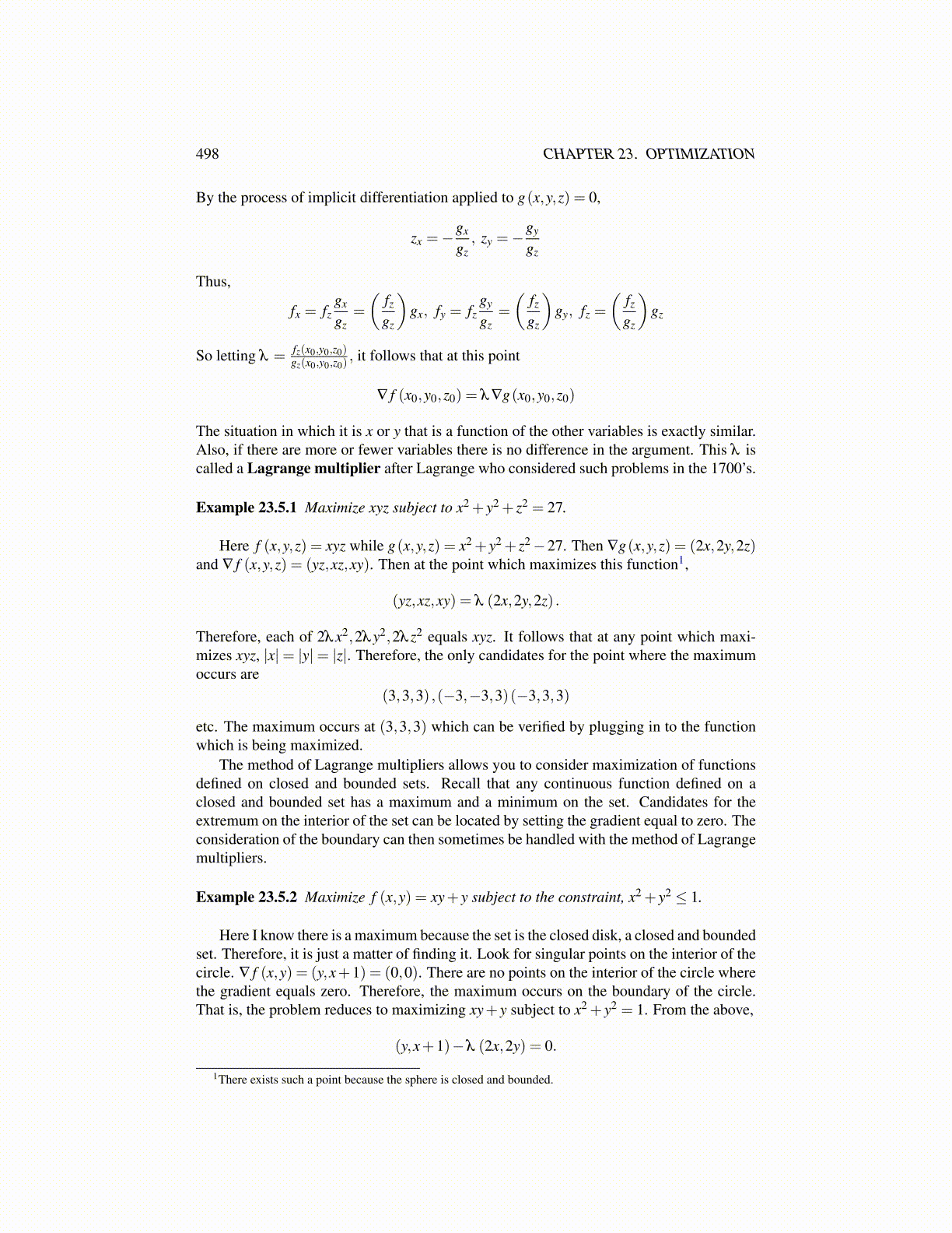 The above generalizes to a general procedure which is described in the following majorTheorem. All correct proofs of this theorem will involve some appeal to the implicit func-tion theorem or to fundamental existence theorems from differential equations. A completeproof is very fascinating but it will not come cheap. Good advanced calculus books willusually give a correct proof. If you are interested, there is a complete proof later. First hereis a simple definition explaining one of the terms in the statement of this theorem.