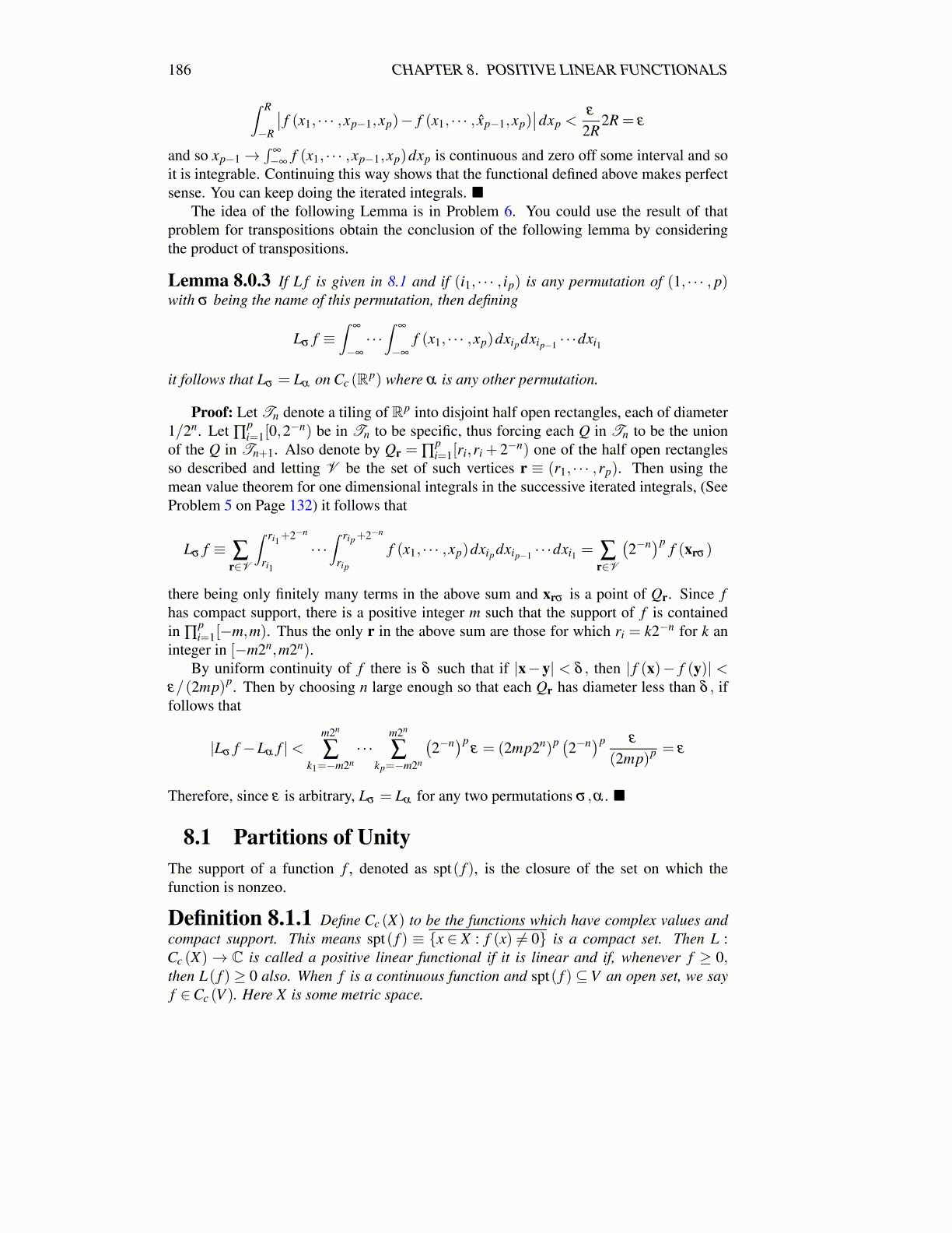 Definition 8.1.1 Define Cc (X) to be the functions which have complex values andcompact support. This means spt( f ) ≡ {x ∈ X : f (x) ̸= 0} is a compact set. Then L :Cc (X)→ C is called a positive linear functional if it is linear and if, whenever f ≥ 0,then L( f ) ≥ 0 also. When f is a continuous function and spt( f ) ⊆ V an open set, we sayf ∈Cc (V ). Here X is some metric space.