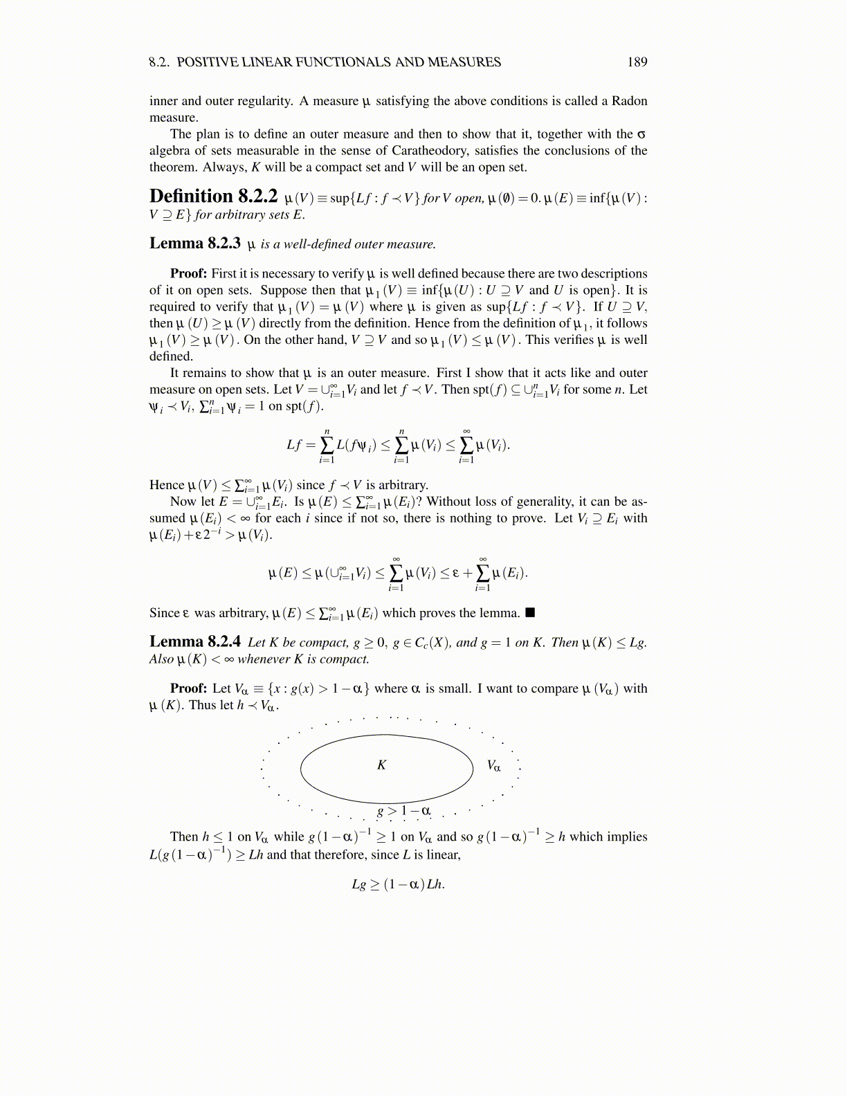 Lemma 8.2.4 Let K be compact, g≥ 0, g ∈Cc(X), and g = 1 on K. Then µ(K)≤ Lg.Also µ(K)< ∞ whenever K is compact.