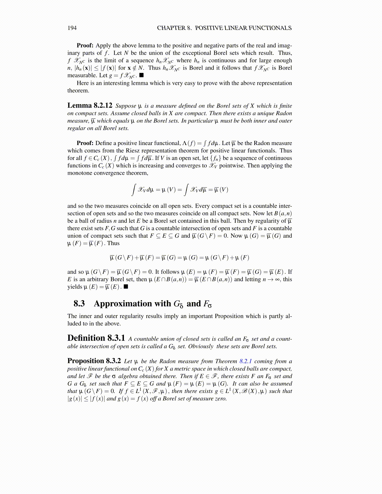 Proposition 8.3.2 Let µ be the Radon measure from Theorem 8.2.1 coming from apositive linear functional on Cc (X) for X a metric space in which closed balls are compact,and let F be the σ algebra obtained there. Then if E ∈F , there exists F an Fσ set andG a Gδ set such that F ⊆ E ⊆ G and µ (F) = µ (E) = µ (G). It can also be assumedthat µ (G\F) = 0. If f ∈ L1 (X ,F ,µ) , then there exists g ∈ L1 (X ,B (X) ,µ) such that|g(x)| ≤ | f (x)| and g(x) = f (x) off a Borel set of measure zero.