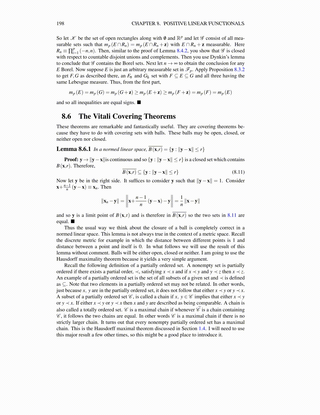 Recall the following definition of a partially ordered set. A nonempty set is partiallyordered if there exists a partial order, ≺, satisfying x≺ x and if x≺ y and y≺ z then x≺ z.An example of a partially ordered set is the set of all subsets of a given set and≺ is definedas ⊆. Note that two elements in a partially ordered set may not be related. In other words,just because x, y are in the partially ordered set, it does not follow that either x≺ y or y≺ x.A subset of a partially ordered set C , is called a chain if x, y ∈ C implies that either x≺ yor y≺ x. If either x≺ y or y≺ x then x and y are described as being comparable. A chain isalso called a totally ordered set. C is a maximal chain if whenever C̃ is a chain containingC , it follows the two chains are equal. In other words C is a maximal chain if there is nostrictly larger chain. It turns out that every nonempty partially ordered set has a maximalchain. This is the Hausdorff maximal theorem discussed in Section 1.4. I will need to usethis major result a few other times, so this might be a good place to introduce it.