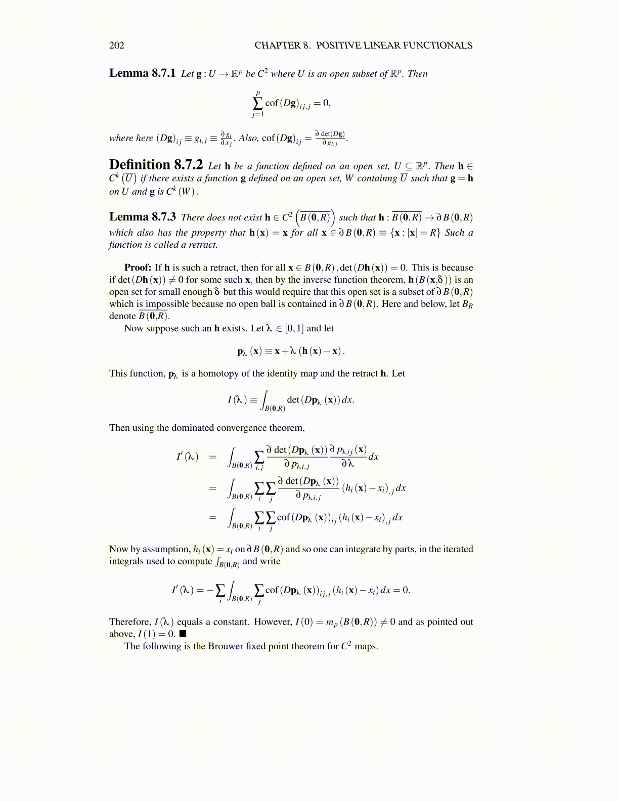 Proof: If h is such a retract, then for all x ∈ B(0,R) ,det(Dh(x)) = 0. This is becauseif det(Dh(x)) ̸= 0 for some such x, then by the inverse function theorem, h(B(x,δ )) is anopen set for small enough δ but this would require that this open set is a subset of ∂B(0,R)which is impossible because no open ball is contained in ∂B(0,R). Here and below, let BRdenote B(0,R).