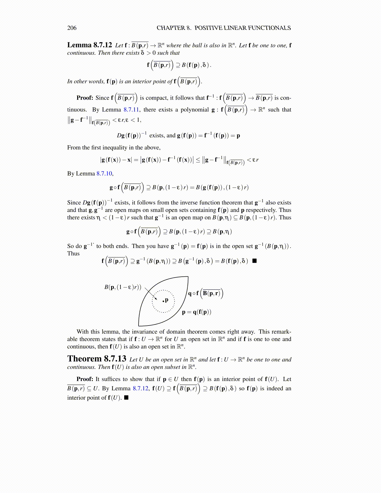 Lemma 8.7.12 Let f : B(p,r)→ Rn where the ball is also in Rn. Let f be one to one, fcontinuous. Then there exists δ > 0 such that