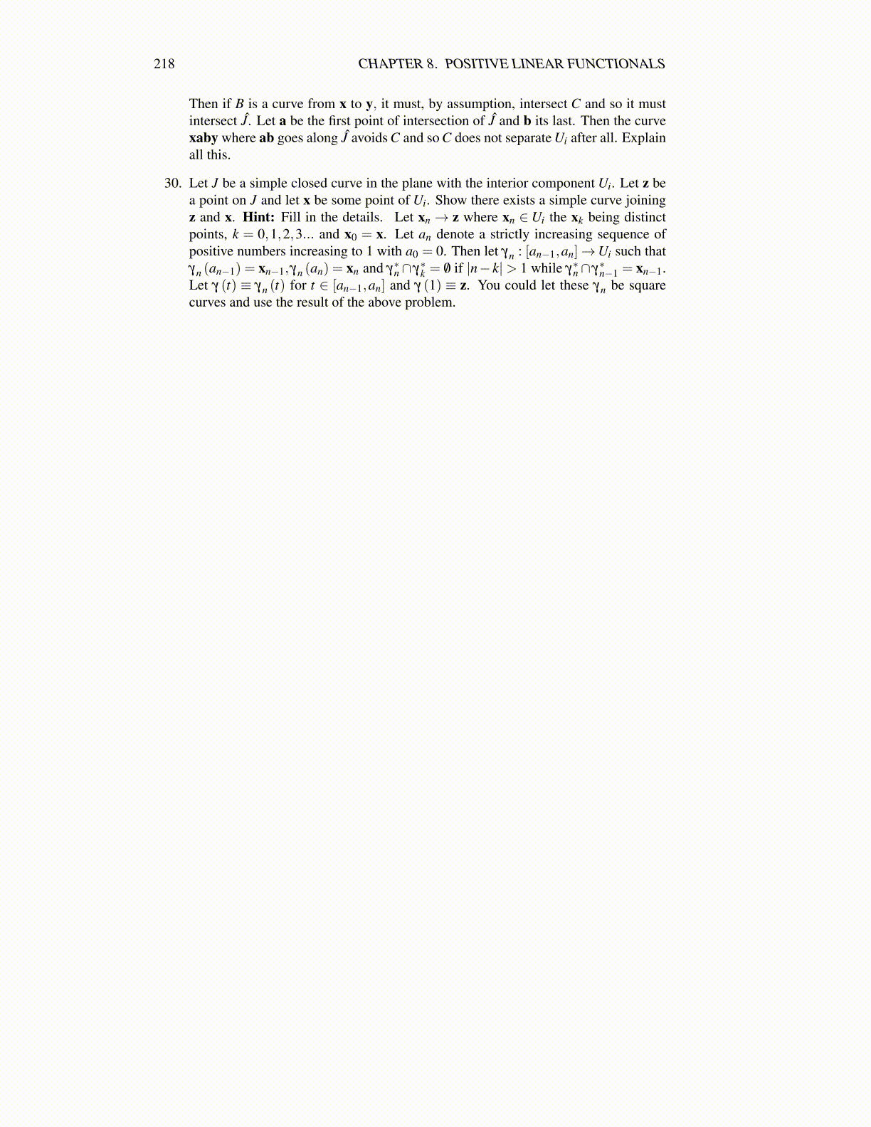 30. Let J be a simple closed curve in the plane with the interior component Ui. Let z bea point on J and let x be some point of Ui. Show there exists a simple curve joiningz and x. Hint: Fill in the details. Let xn → z where xn ∈Ui the xk being distinctpoints, k = 0,1,2,3... and x0 = x. Let an denote a strictly increasing sequence ofpositive numbers increasing to 1 with a0 = 0. Then let γn : [an−1,an]→Ui such thatγn (an−1) = xn−1,γn (an) = xn and γ∗n∩ γ∗k = /0 if |n− k|> 1 while γ∗n∩ γ∗n−1 = xn−1.Let γ (t) ≡ γn (t) for t ∈ [an−1,an] and γ (1) ≡ z. You could let these γn be squarecurves and use the result of the above problem.
