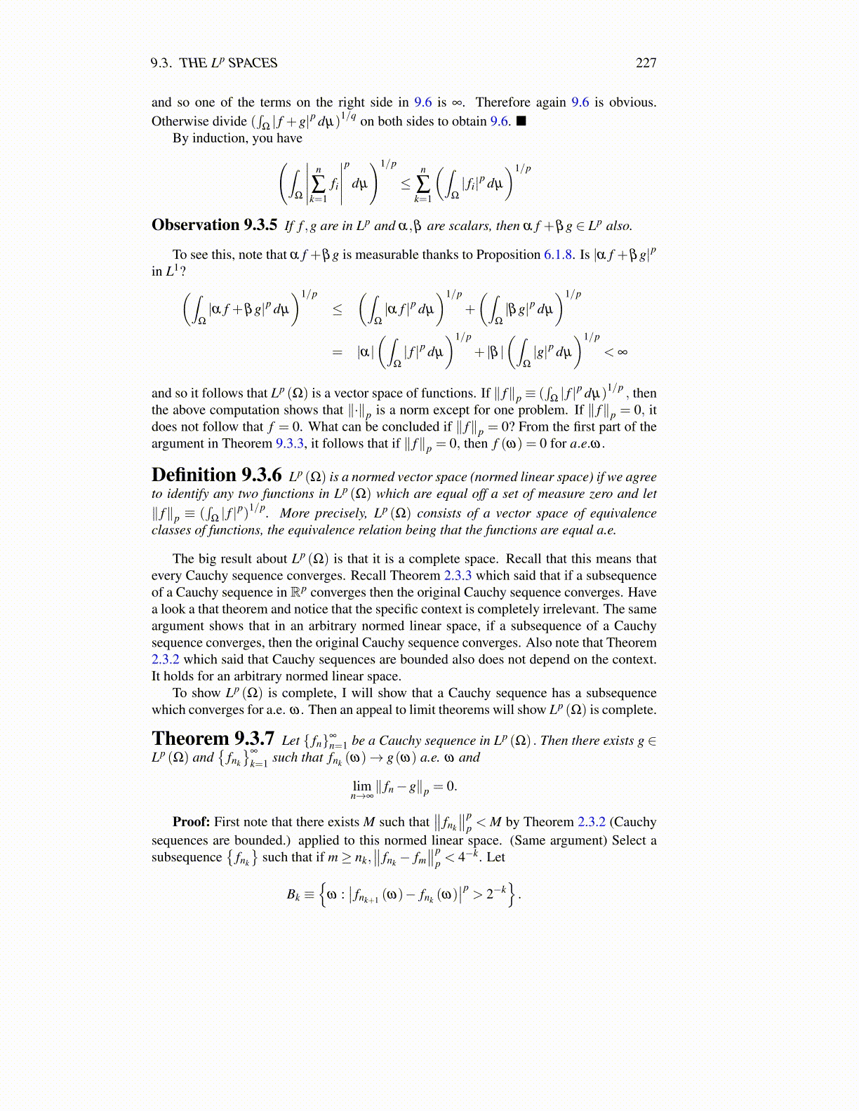 The big result about Lp (Ω) is that it is a complete space. Recall that this means thatevery Cauchy sequence converges. Recall Theorem 2.3.3 which said that if a subsequenceof a Cauchy sequence in Rp converges then the original Cauchy sequence converges. Havea look a that theorem and notice that the specific context is completely irrelevant. The sameargument shows that in an arbitrary normed linear space, if a subsequence of a Cauchysequence converges, then the original Cauchy sequence converges. Also note that Theorem2.3.2 which said that Cauchy sequences are bounded also does not depend on the context.It holds for an arbitrary normed linear space.
