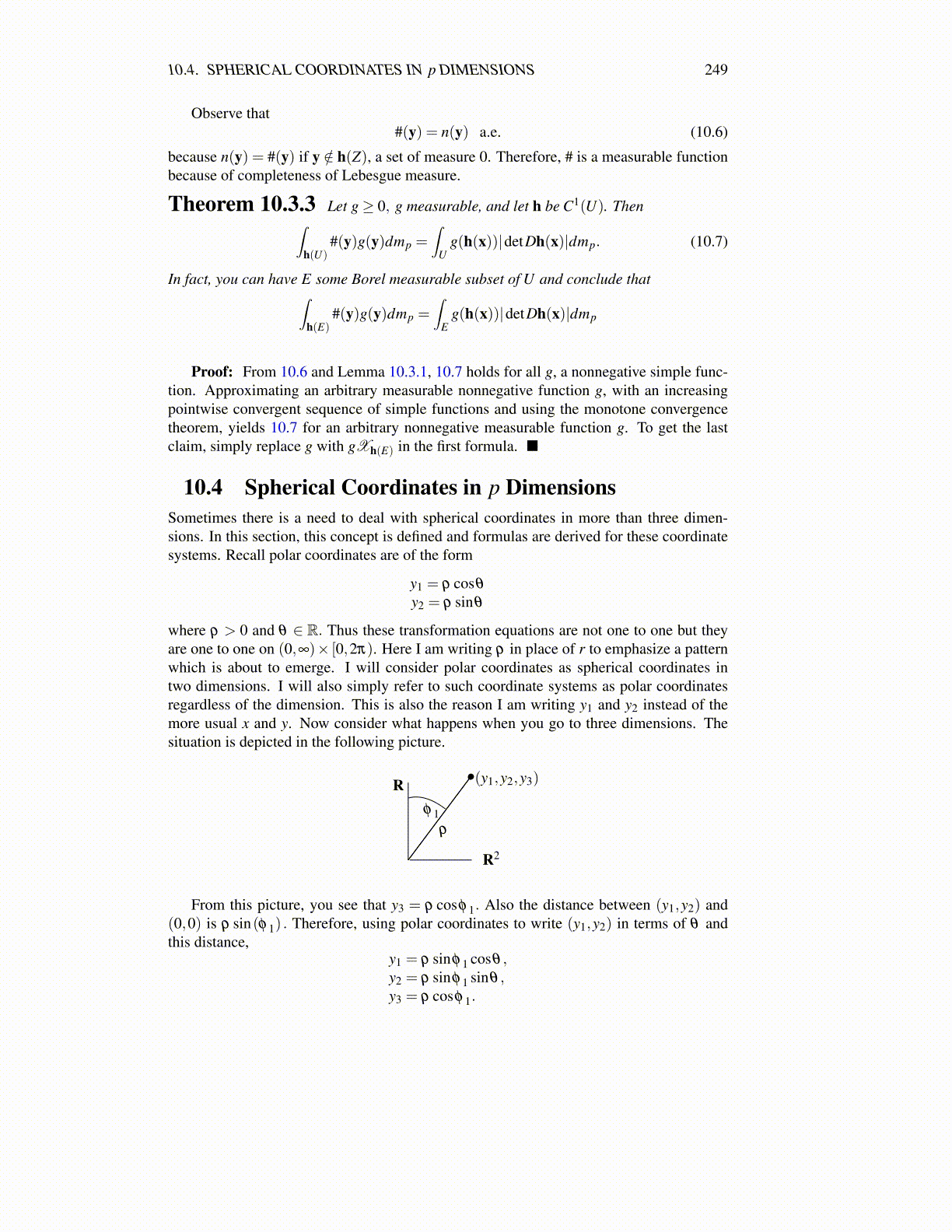 10.4 Spherical Coordinates in p DimensionsSometimes there is a need to deal with spherical coordinates in more than three dimen-sions. In this section, this concept is defined and formulas are derived for these coordinatesystems. Recall polar coordinates are of the form