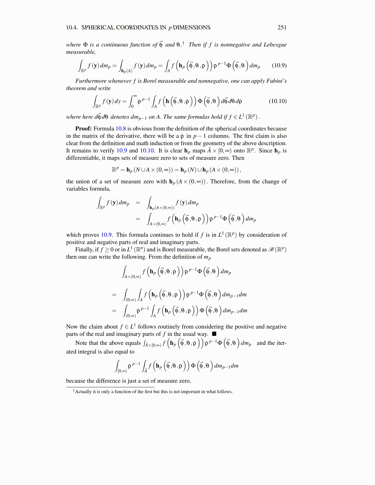 Proof: Formula 10.8 is obvious from the definition of the spherical coordinates becausein the matrix of the derivative, there will be a ρ in p− 1 columns. The first claim is alsoclear from the definition and math induction or from the geometry of the above description.It remains to verify 10.9 and 10.10. It is clear hp maps Ā× [0,∞) onto Rp. Since hp isdifferentiable, it maps sets of measure zero to sets of measure zero. Then