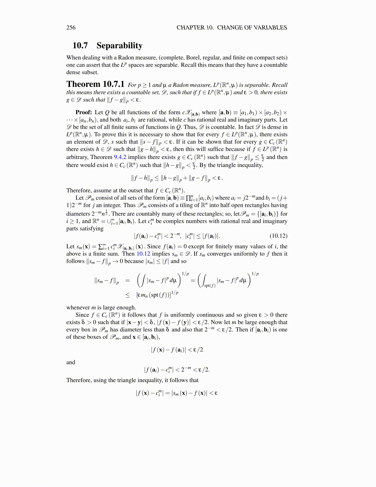Theorem 10.7.1 For p≥ 1 and µ a Radon measure, Lp(Rn,µ) is separable. Recallthis means there exists a countable set, D , such that if f ∈ Lp(Rn,µ) and ε > 0, there existsg ∈D such that ∥ f −g∥p < ε .