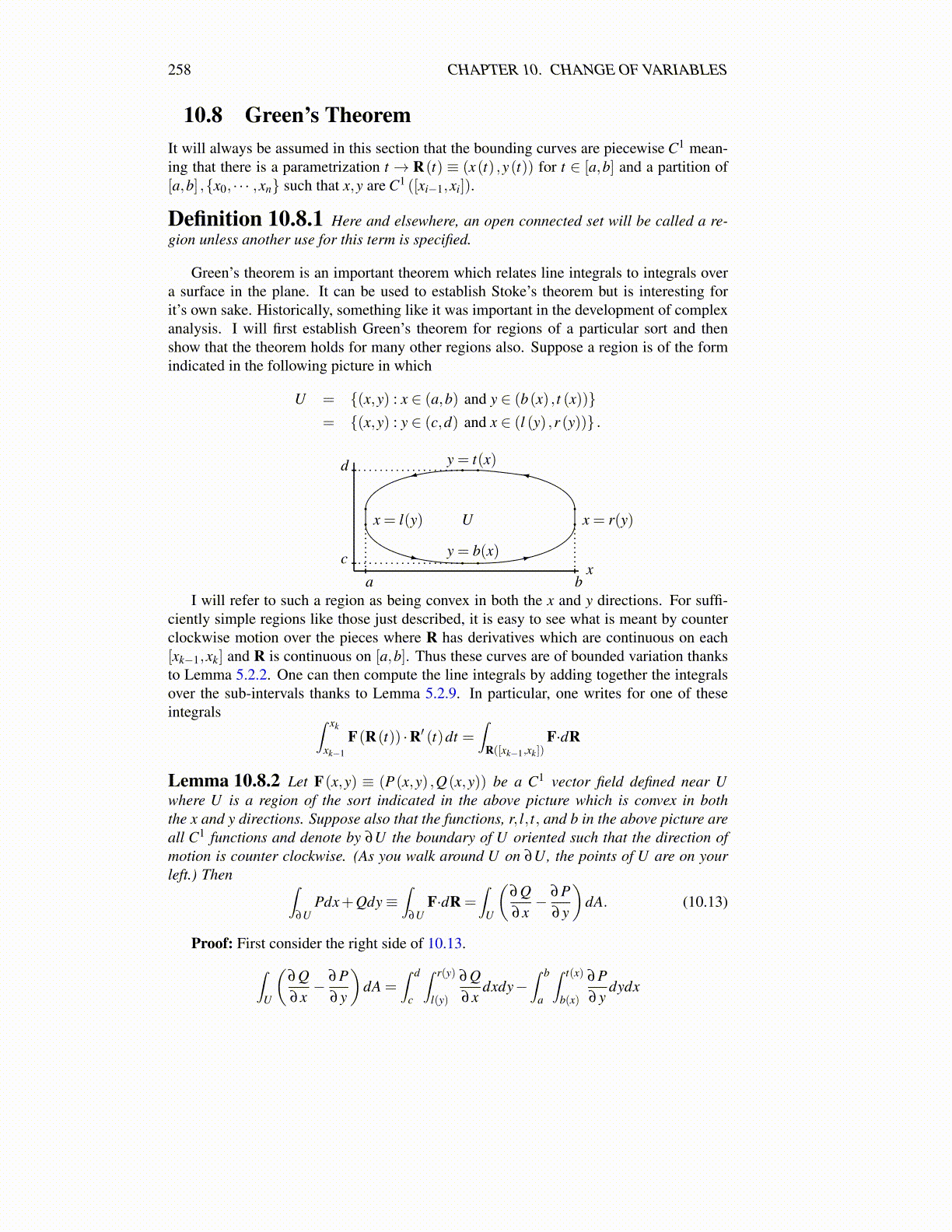Lemma 10.8.2 Let F(x,y) ≡ (P(x,y) ,Q(x,y)) be a C1 vector field defined near Uwhere U is a region of the sort indicated in the above picture which is convex in boththe x and y directions. Suppose also that the functions, r, l, t, and b in the above picture areall C1 functions and denote by ∂U the boundary of U oriented such that the direction ofmotion is counter clockwise. (As you walk around U on ∂U, the points of U are on yourleft.) Then ∫