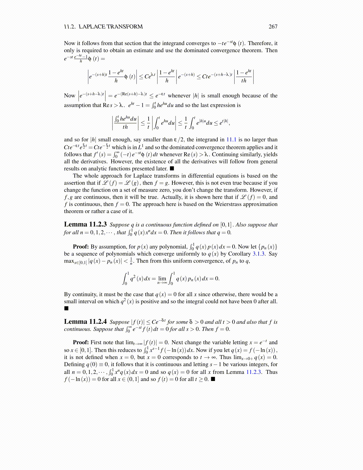 The whole approach for Laplace transforms in differential equations is based on theassertion that if L ( f ) = L (g) , then f = g. However, this is not even true because if youchange the function on a set of measure zero, you don’t change the transform. However, iff ,g are continuous, then it will be true. Actually, it is shown here that if L ( f ) = 0, andf is continuous, then f = 0. The approach here is based on the Weierstrass approximationtheorem or rather a case of it.