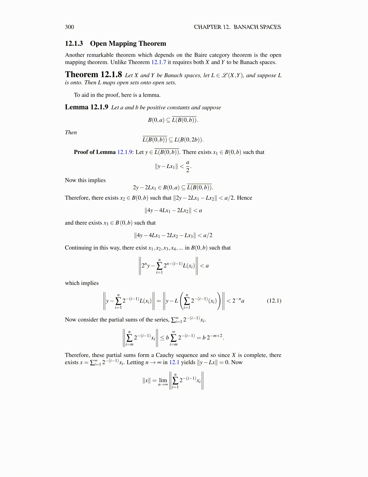 Theorem 12.1.8 Let X and Y be Banach spaces, let L ∈L (X ,Y ), and suppose Lis onto. Then L maps open sets onto open sets.