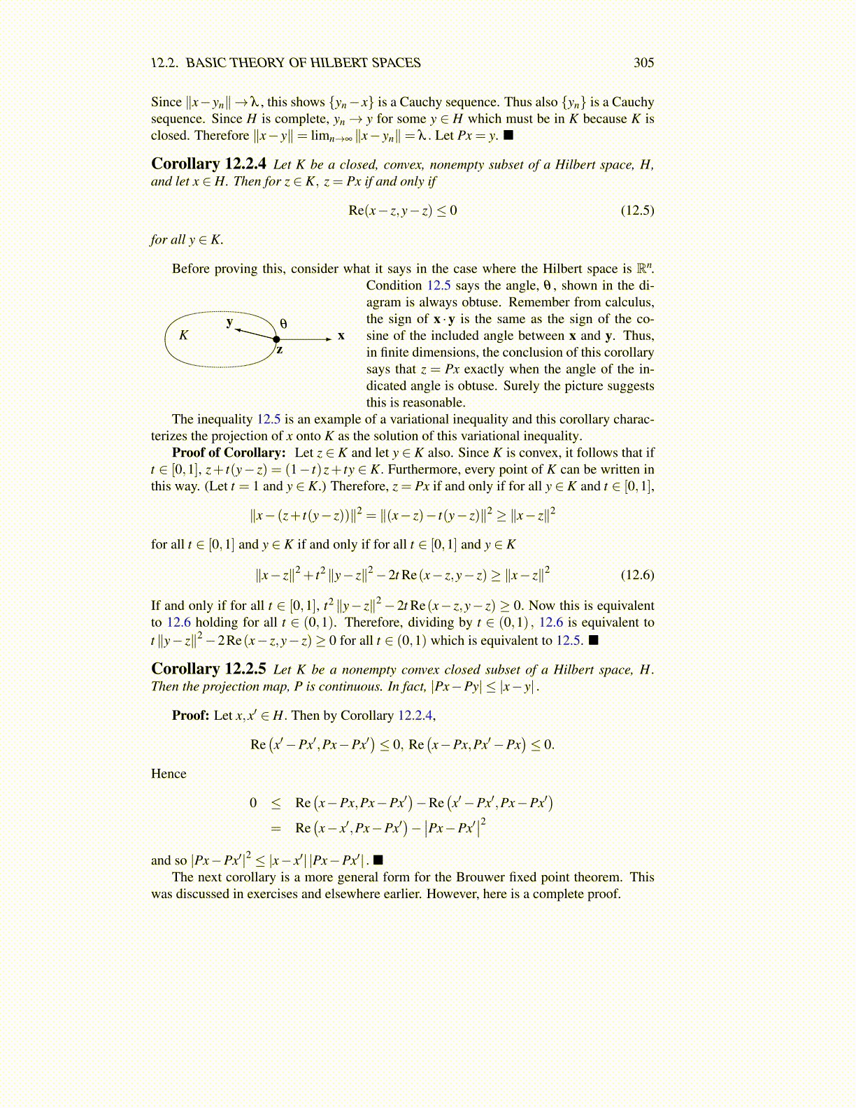 Corollary 12.2.4 Let K be a closed, convex, nonempty subset of a Hilbert space, H,and let x ∈ H. Then for z ∈ K, z = Px if and only if