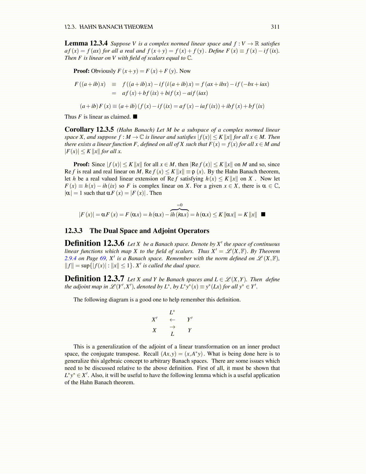 Corollary 12.3.5 (Hahn Banach) Let M be a subspace of a complex normed linearspace X, and suppose f : M→ C is linear and satisfies | f (x)| ≤ K ∥x∥ for all x ∈M. Thenthere exists a linear function F, defined on all of X such that F(x) = f (x) for all x ∈M and|F(x)| ≤ K ∥x∥ for all x.