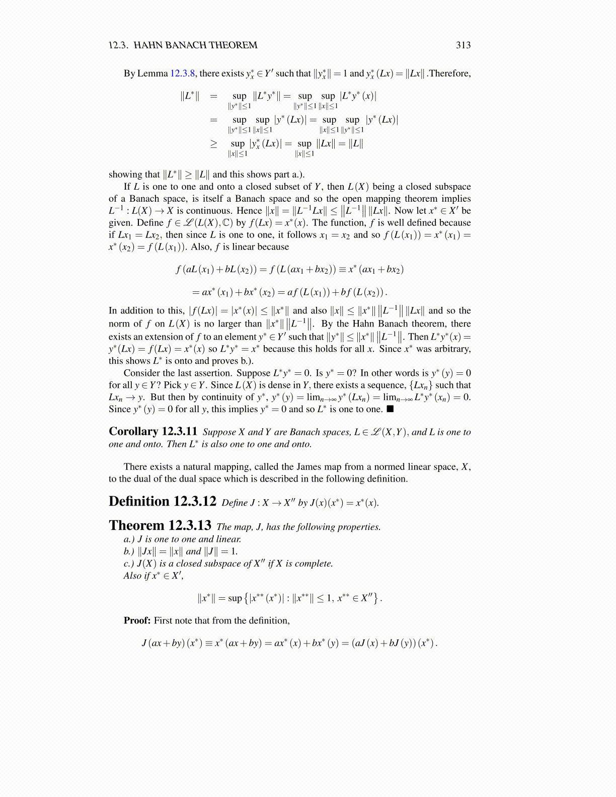 Theorem 12.3.13 The map, J, has the following properties.a.) J is one to one and linear.b.) ∥Jx∥= ∥x∥ and ∥J∥= 1.c.) J(X) is a closed subspace of X ′′ if X is complete.Also if x∗ ∈ X ′,