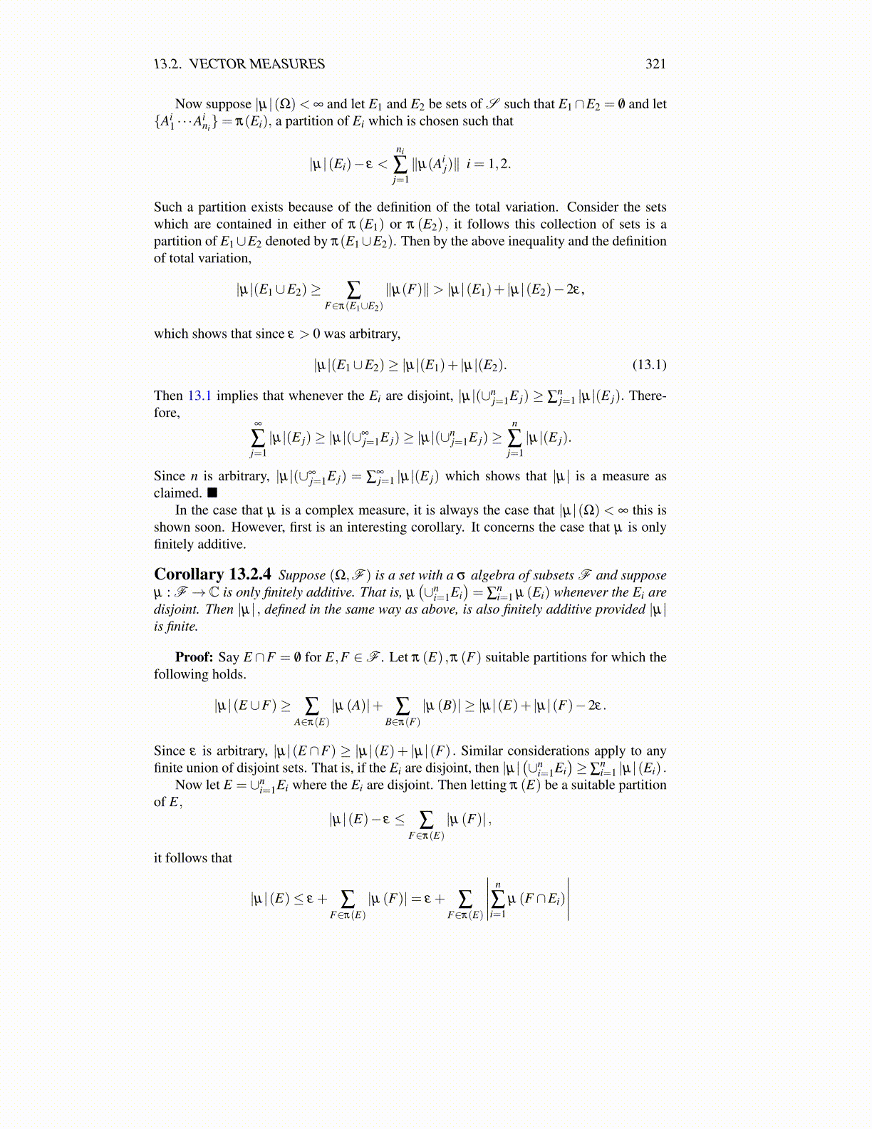 Since ε is arbitrary, |µ|(E ∩F) ≥ |µ|(E)+ |µ|(F) . Similar considerations apply to anyfinite union of disjoint sets. That is, if the Ei are disjoint, then |µ|