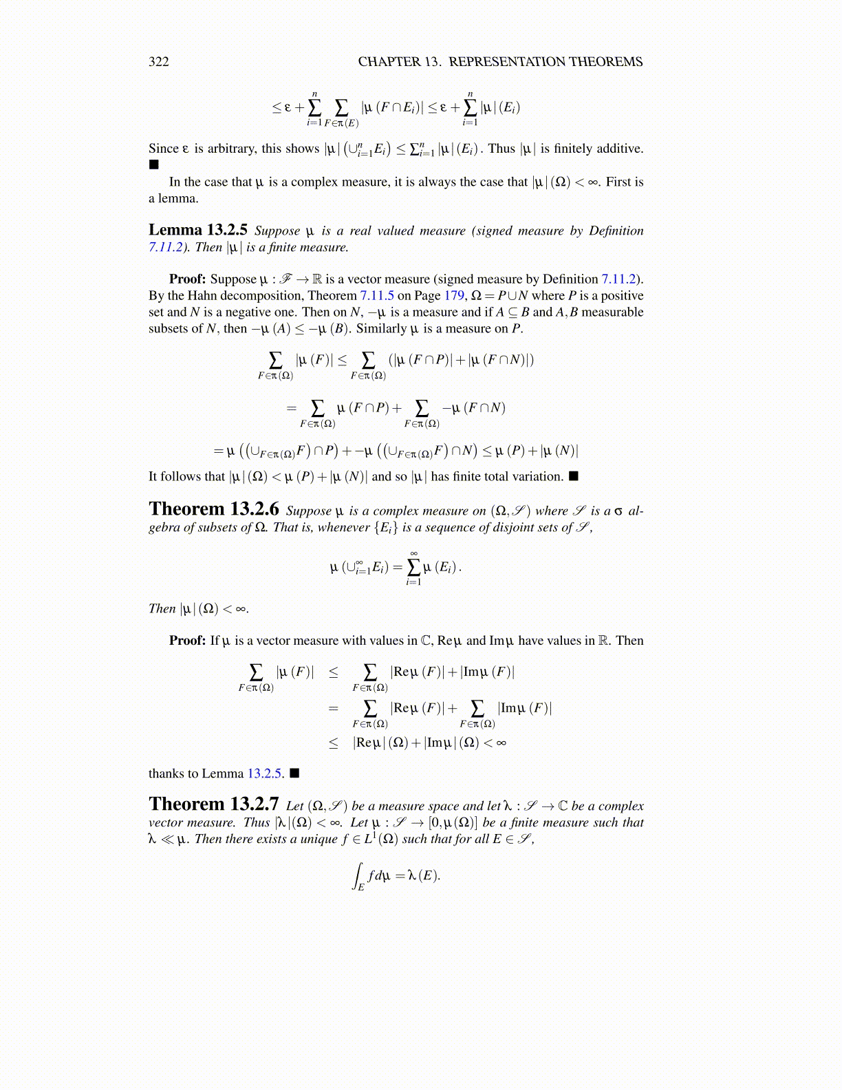 Theorem 13.2.7 Let (Ω,S ) be a measure space and let λ : S → C be a complexvector measure. Thus |λ |(Ω) < ∞. Let µ : S → [0,µ(Ω)] be a finite measure such thatλ ≪ µ . Then there exists a unique f ∈ L1(Ω) such that for all E ∈S ,∫