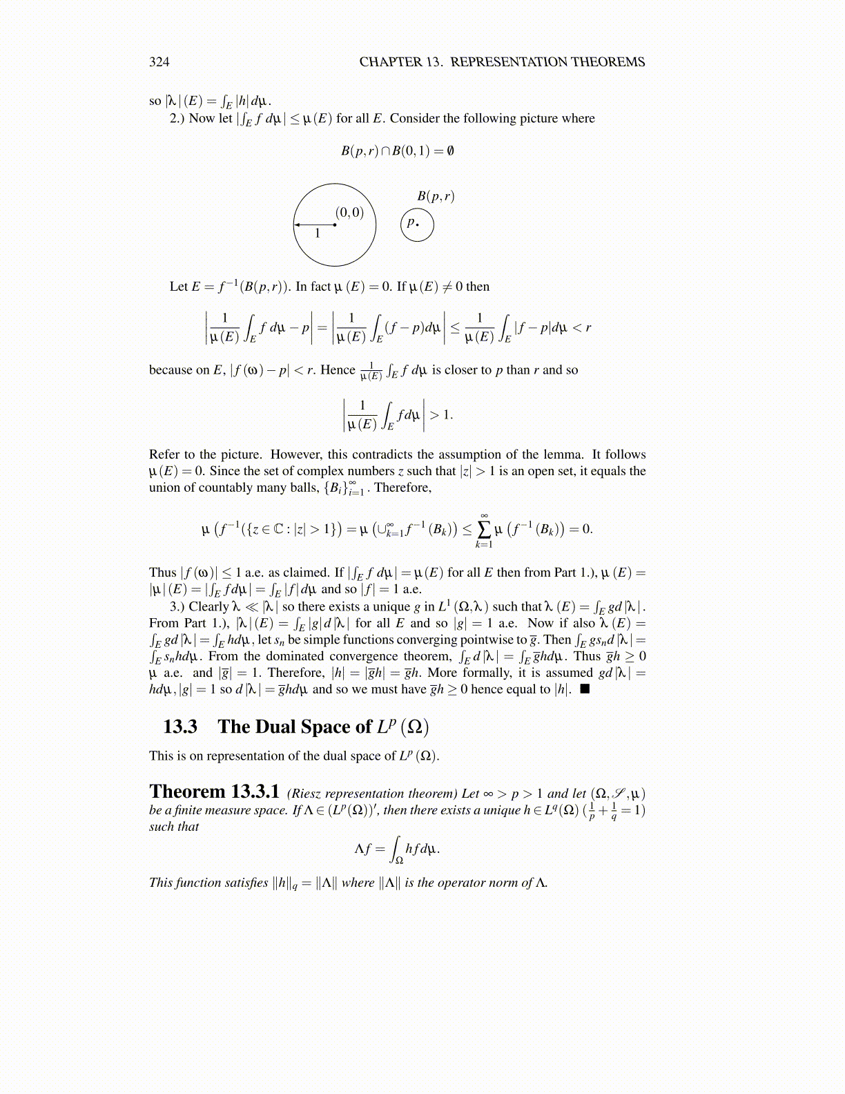 Theorem 13.3.1 (Riesz representation theorem) Let ∞ > p > 1 and let (Ω,S ,µ)be a finite measure space. If Λ∈ (Lp(Ω))′, then there exists a unique h∈ Lq(Ω) ( 1