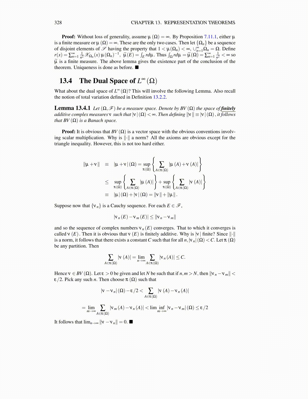 Lemma 13.4.1 Let (Ω,F ) be a measure space. Denote by BV (Ω) the space of finitelyadditive complex measures ν such that |ν |(Ω)<∞. Then defining ∥ν∥≡ |ν |(Ω) , it followsthat BV (Ω) is a Banach space.