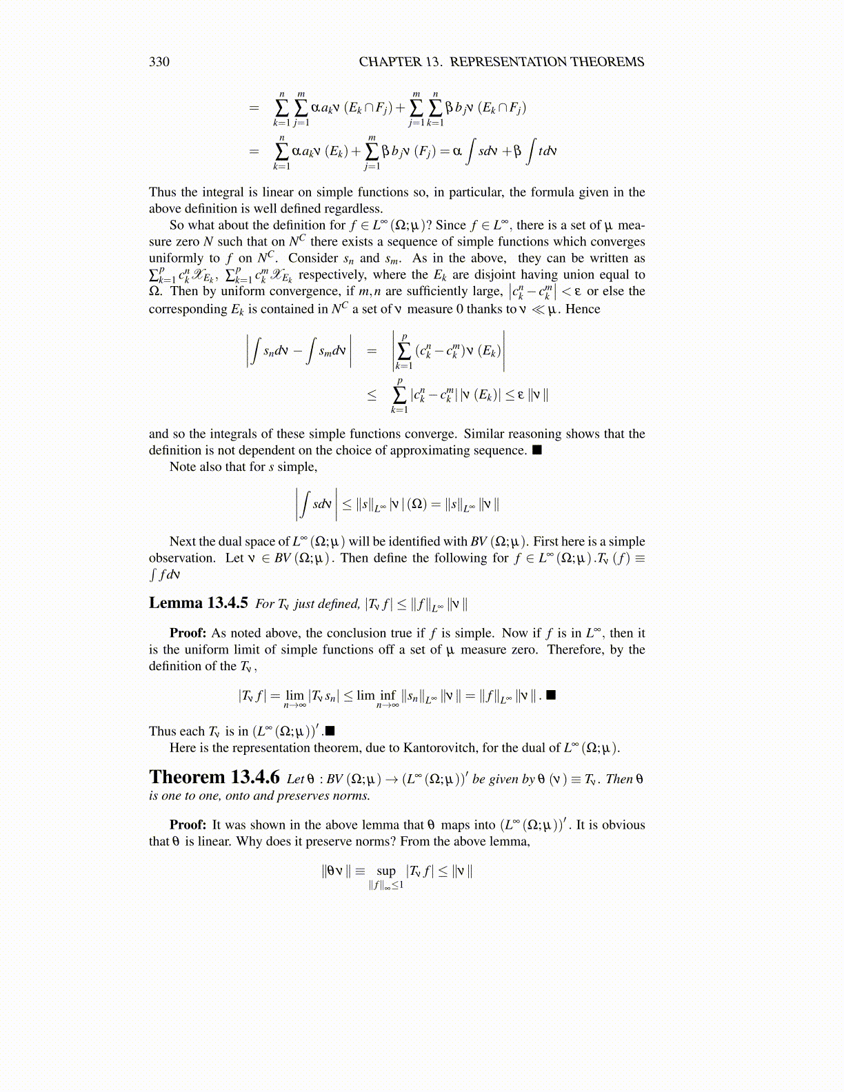 Thus each Tν is in (L∞ (Ω; µ))′ .■Here is the representation theorem, due to Kantorovitch, for the dual of L∞ (Ω; µ).