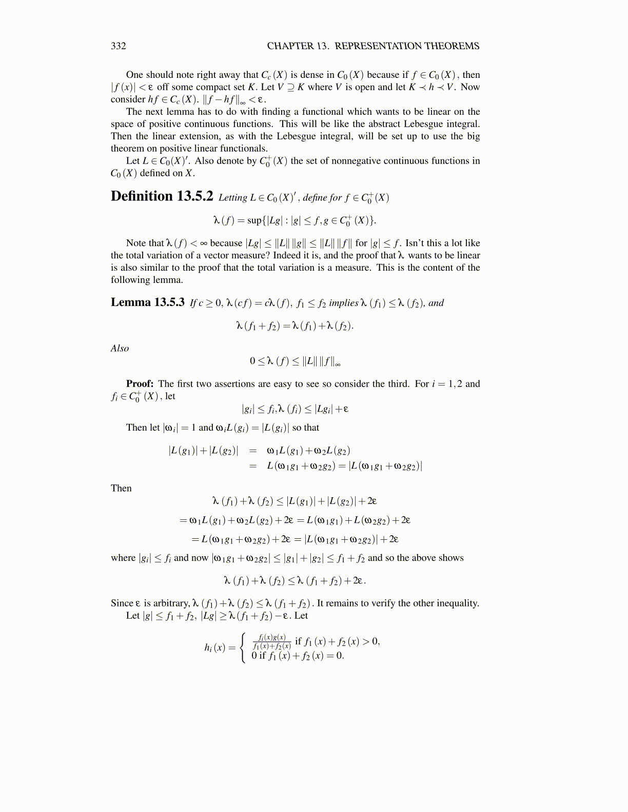 The next lemma has to do with finding a functional which wants to be linear on thespace of positive continuous functions. This will be like the abstract Lebesgue integral.Then the linear extension, as with the Lebesgue integral, will be set up to use the bigtheorem on positive linear functionals.