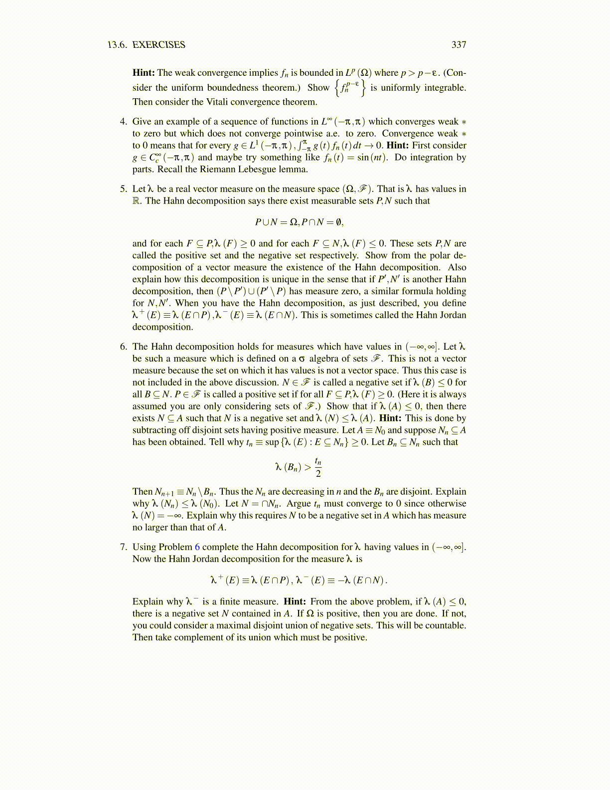 5. Let λ be a real vector measure on the measure space (Ω,F ). That is λ has values inR. The Hahn decomposition says there exist measurable sets P,N such that
