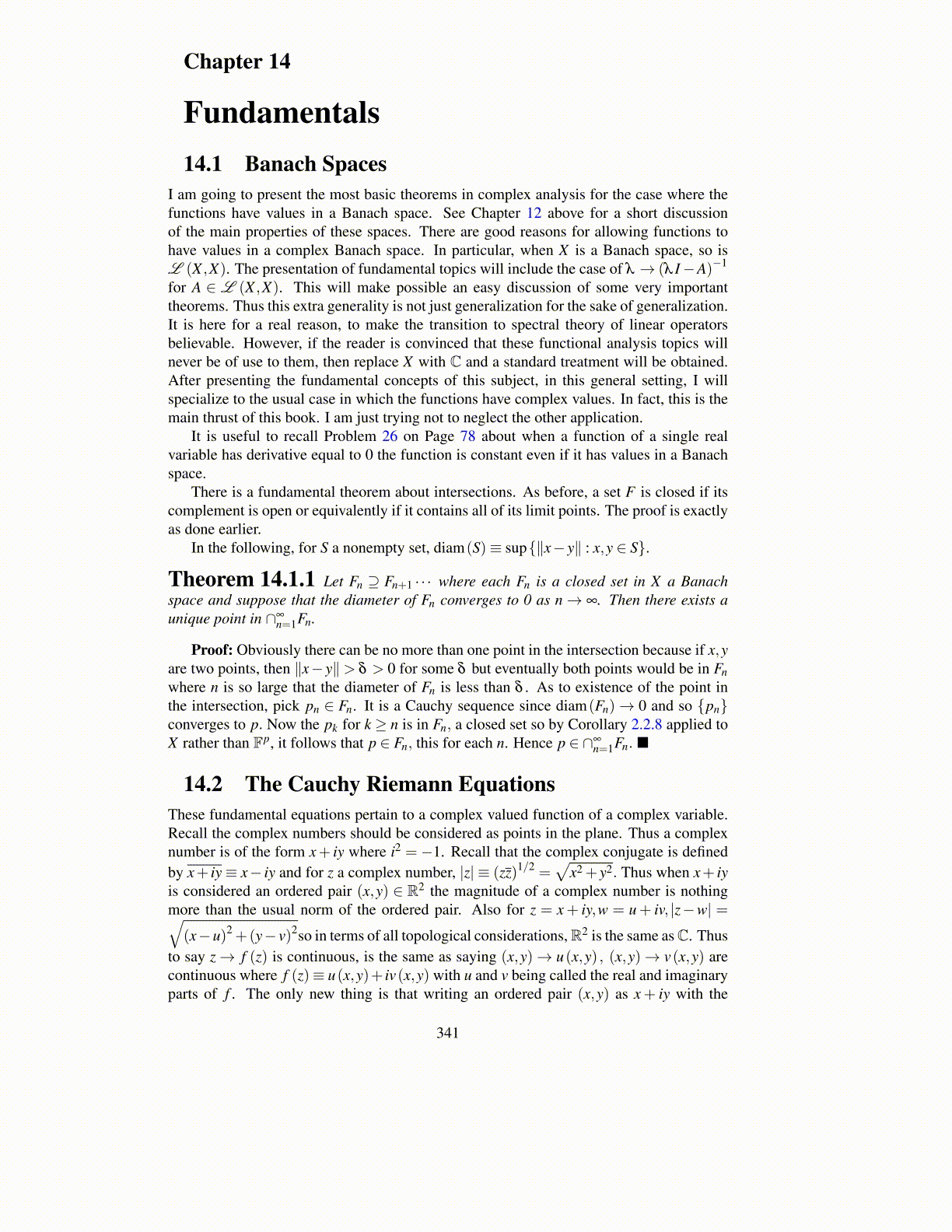 Theorem 14.1.1 Let Fn ⊇ Fn+1 · · · where each Fn is a closed set in X a Banachspace and suppose that the diameter of Fn converges to 0 as n→ ∞. Then there exists aunique point in ∩∞