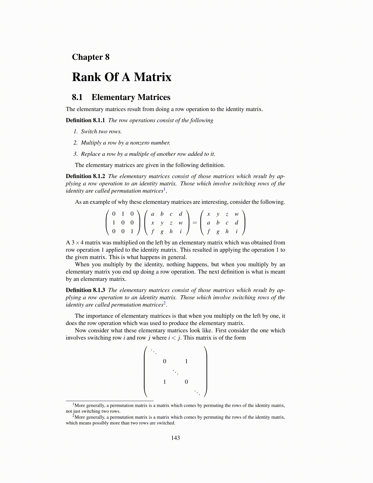 Definition 8.1.2 The elementary matrices consist of those matrices which result by ap-plying a row operation to an identity matrix. Those which involve switching rows of theidentity are called permutation matrices1.