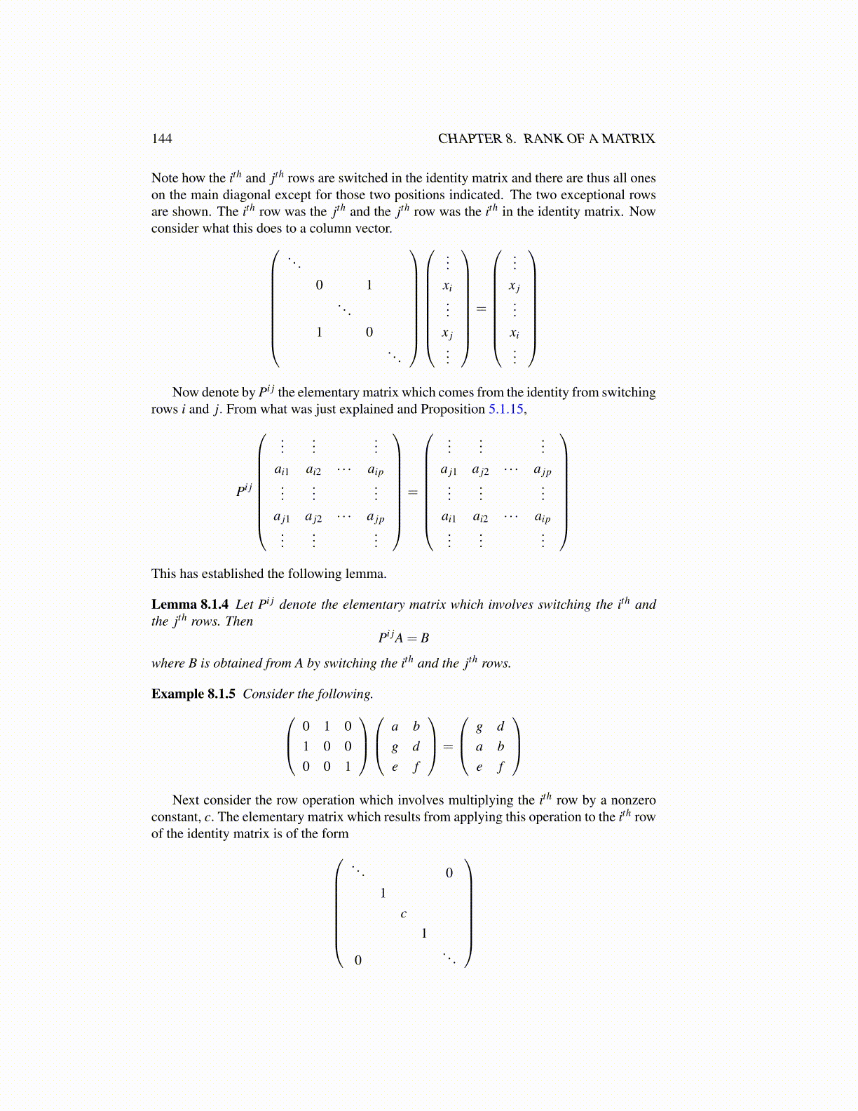 Note how the ith and jth rows are switched in the identity matrix and there are thus all oneson the main diagonal except for those two positions indicated. The two exceptional rowsare shown. The ith row was the jth and the jth row was the ith in the identity matrix. Nowconsider what this does to a column vector.