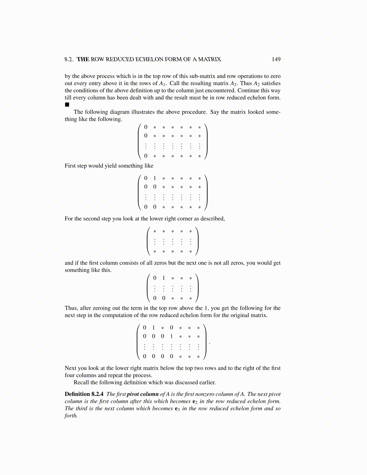 Definition 8.2.4 The first pivot column of A is the first nonzero column of A. The next pivotcolumn is the first column after this which becomes e2 in the row reduced echelon form.The third is the next column which becomes e3 in the row reduced echelon form and soforth.