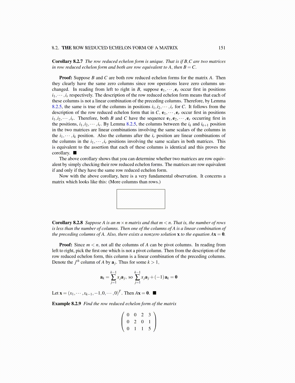 Proof: Suppose B and C are both row reduced echelon forms for the matrix A. Thenthey clearly have the same zero columns since row operations leave zero columns un-changed. In reading from left to right in B, suppose e1, · · · ,er occur first in positionsi1, · · · , ir respectively. The description of the row reduced echelon form means that each ofthese columns is not a linear combination of the preceding columns. Therefore, by Lemma8.2.5, the same is true of the columns in positions i1, i2, · · · , ir for C. It follows from thedescription of the row reduced echelon form that in C, e1, · · · ,er occur first in positionsi1, i2, · · · , ir. Therefore, both B and C have the sequence e1,e2, · · · ,er occurring first inthe positions, i1, i2, · · · , ir. By Lemma 8.2.5, the columns between the ik and ik+1 positionin the two matrices are linear combinations involving the same scalars of the columns inthe i1, · · · , ik position. Also the columns after the ir position are linear combinations ofthe columns in the i1, · · · , ir positions involving the same scalars in both matrices. Thisis equivalent to the assertion that each of these columns is identical and this proves thecorollary. ■