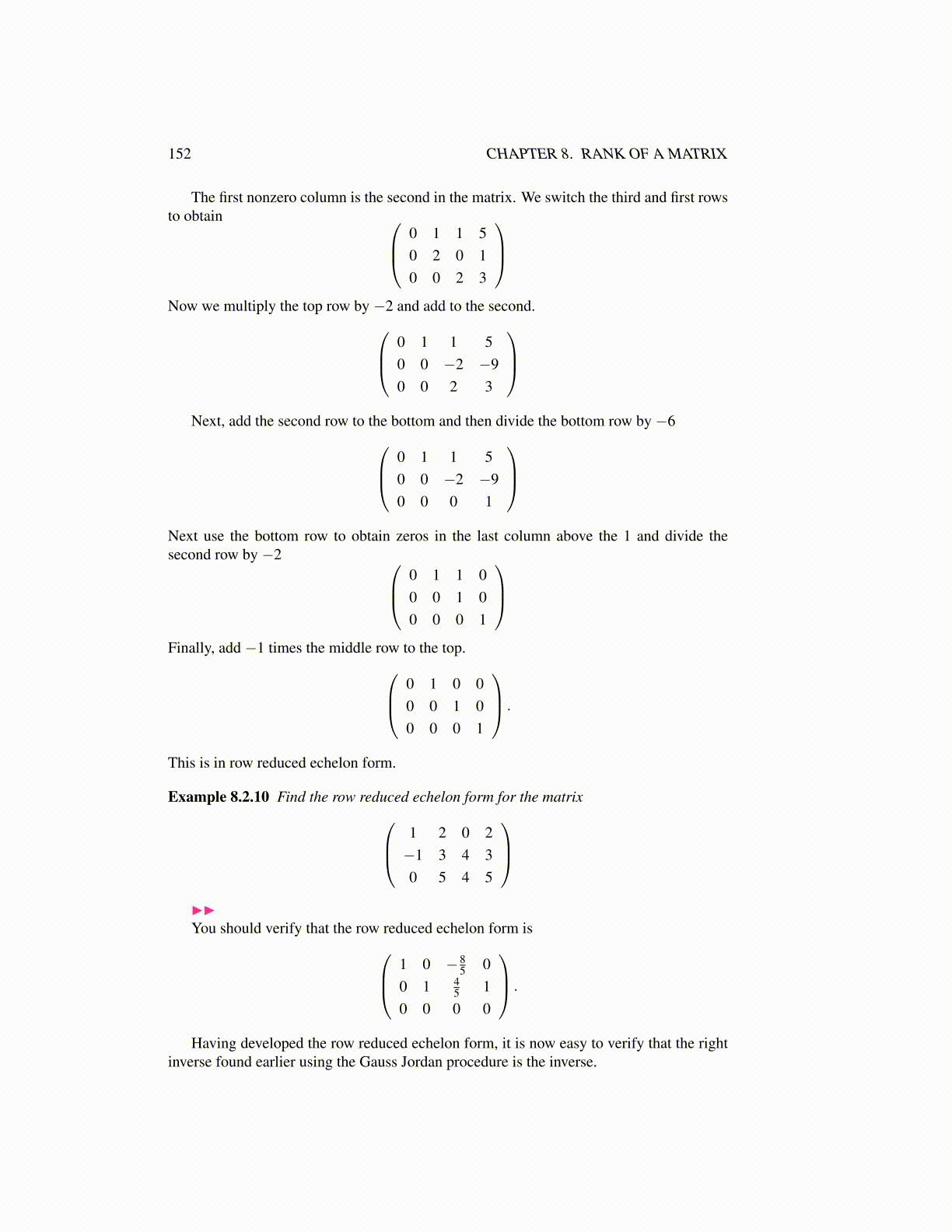 Example 8.2.10 Find the row reduced echelon form for the matrix 1 2 0 2−1 3 4 30 5 4 5