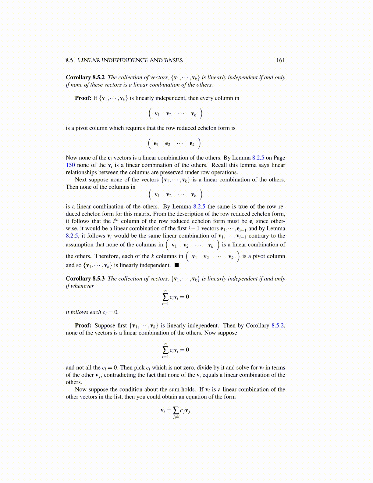 Corollary 8.5.3 The collection of vectors, {v1, · · · ,vk} is linearly independent if and onlyif whenever