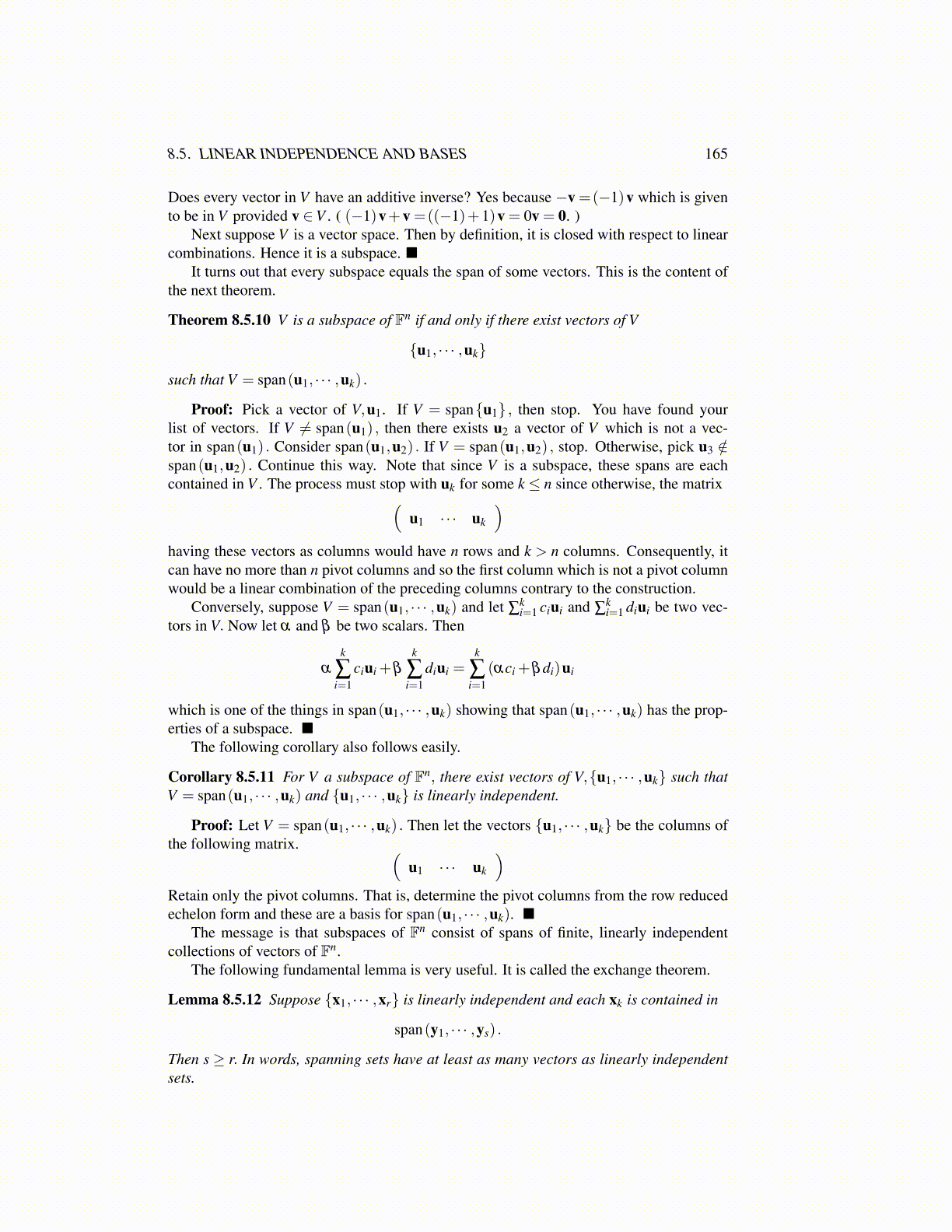 Corollary 8.5.11 For V a subspace of Fn, there exist vectors of V,{u1, · · · ,uk} such thatV = span(u1, · · · ,uk) and {u1, · · · ,uk} is linearly independent.