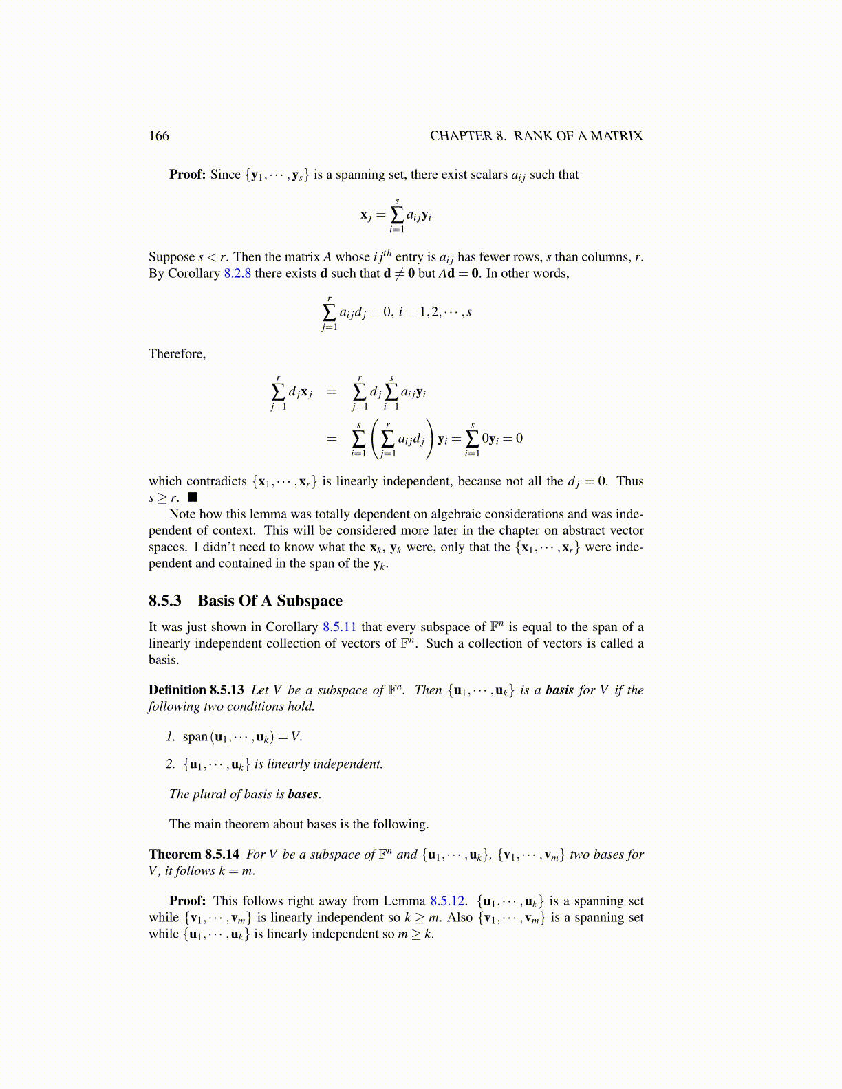 8.5.3 Basis Of A SubspaceIt was just shown in Corollary 8.5.11 that every subspace of Fn is equal to the span of alinearly independent collection of vectors of Fn. Such a collection of vectors is called abasis.