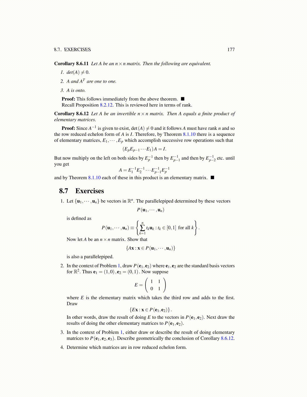 Proof: Since A−1 is given to exist, det(A) ̸= 0 and it follows A must have rank n and sothe row reduced echelon form of A is I. Therefore, by Theorem 8.1.10 there is a sequenceof elementary matrices, E1, · · · ,Ep which accomplish successive row operations such that
