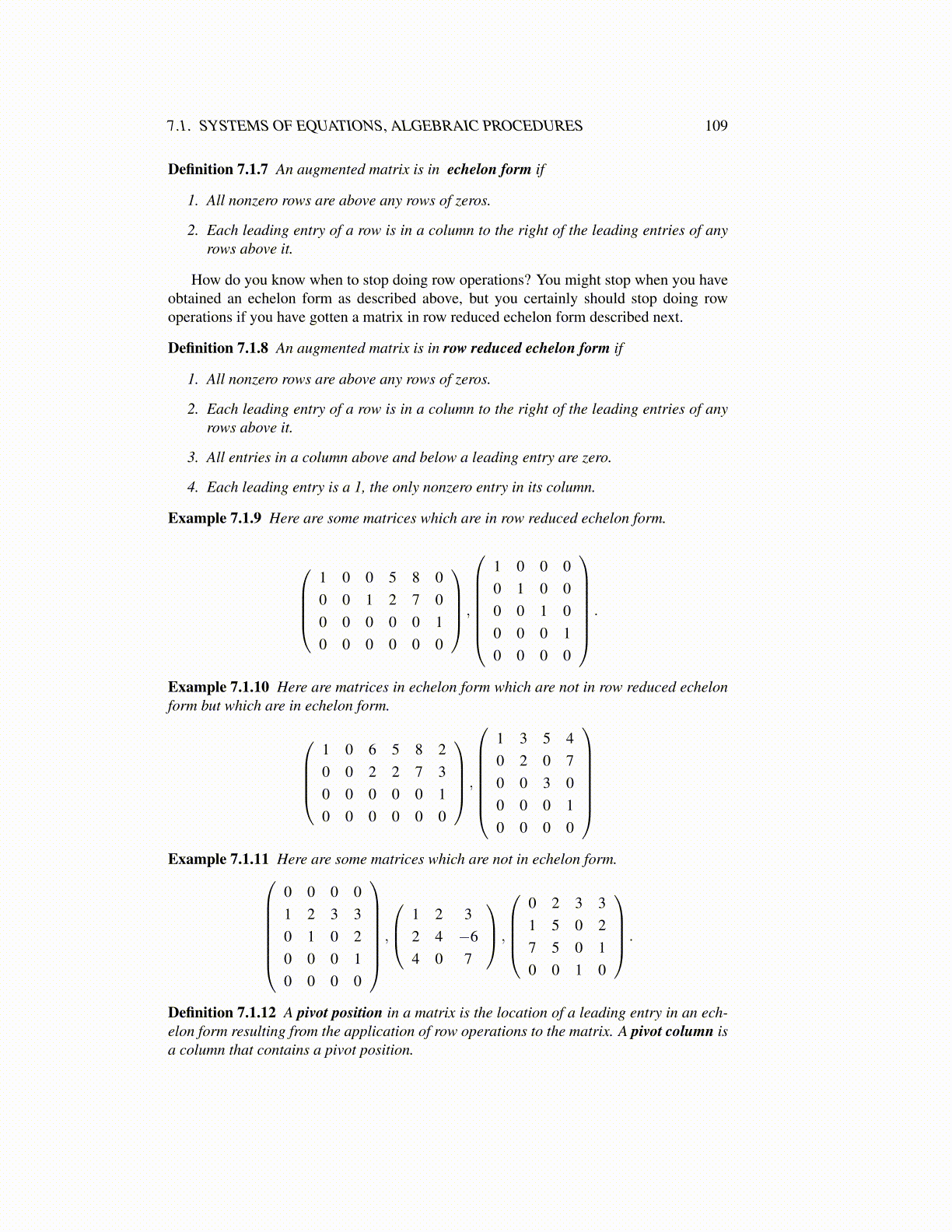 Example 7.1.10 Here are matrices in echelon form which are not in row reduced echelonform but which are in echelon form.