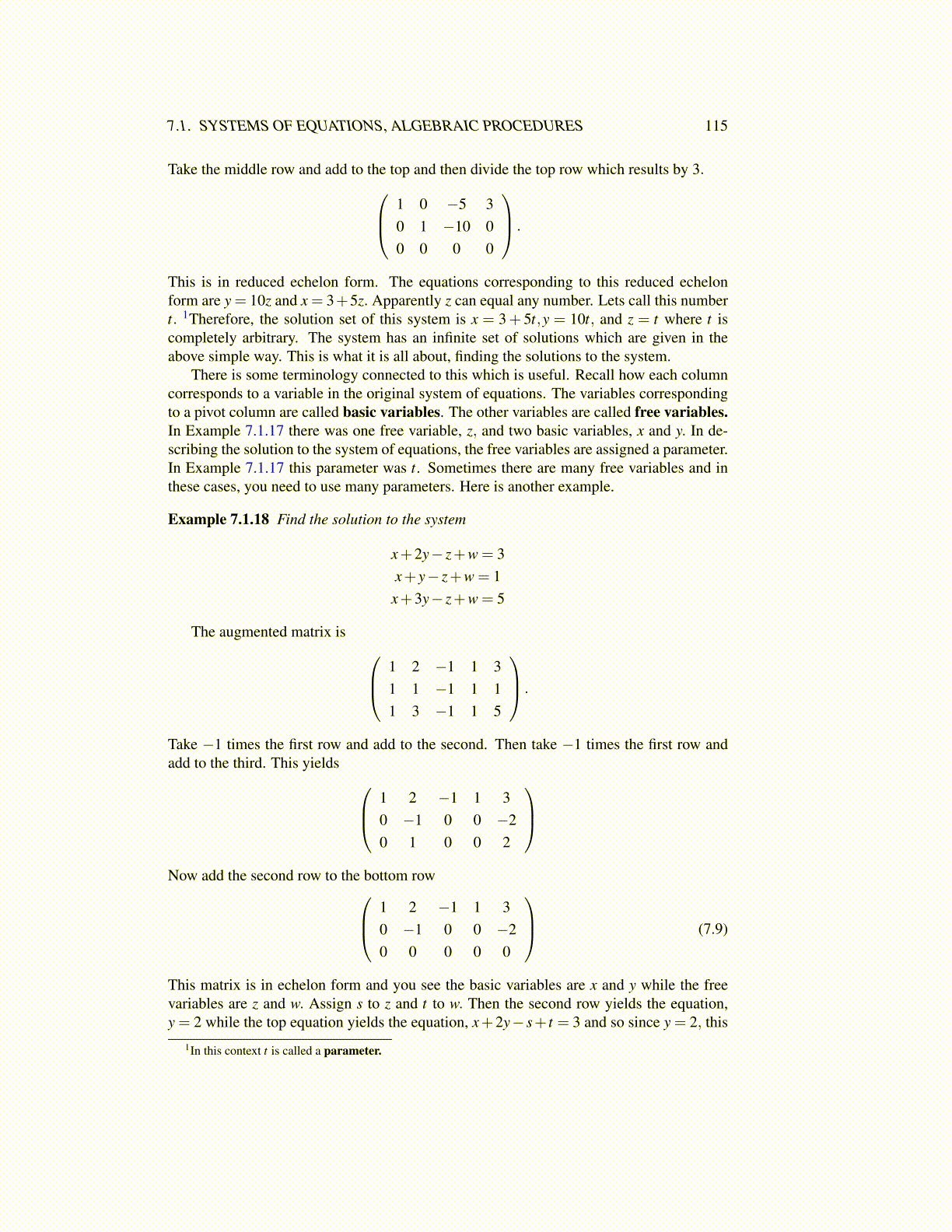 There is some terminology connected to this which is useful. Recall how each columncorresponds to a variable in the original system of equations. The variables correspondingto a pivot column are called basic variables. The other variables are called free variables.In Example 7.1.17 there was one free variable, z, and two basic variables, x and y. In de-scribing the solution to the system of equations, the free variables are assigned a parameter.In Example 7.1.17 this parameter was t. Sometimes there are many free variables and inthese cases, you need to use many parameters. Here is another example.