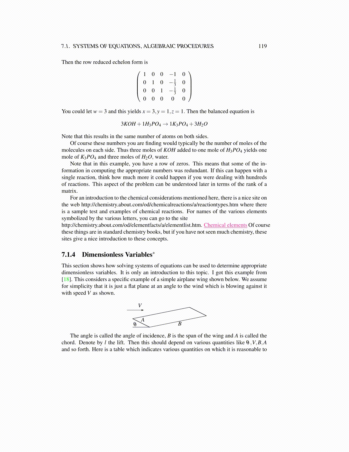 This section shows how solving systems of equations can be used to determine appropriatedimensionless variables. It is only an introduction to this topic. I got this example from[18]. This considers a specific example of a simple airplane wing shown below. We assumefor simplicity that it is just a flat plane at an angle to the wind which is blowing against itwith speed V as shown.