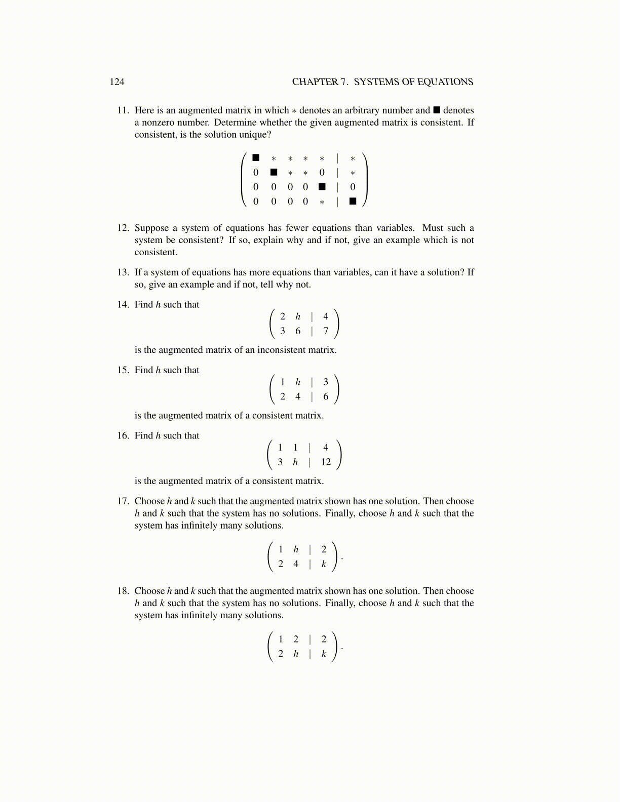 18. Choose h and k such that the augmented matrix shown has one solution. Then chooseh and k such that the system has no solutions. Finally, choose h and k such that thesystem has infinitely many solutions.(