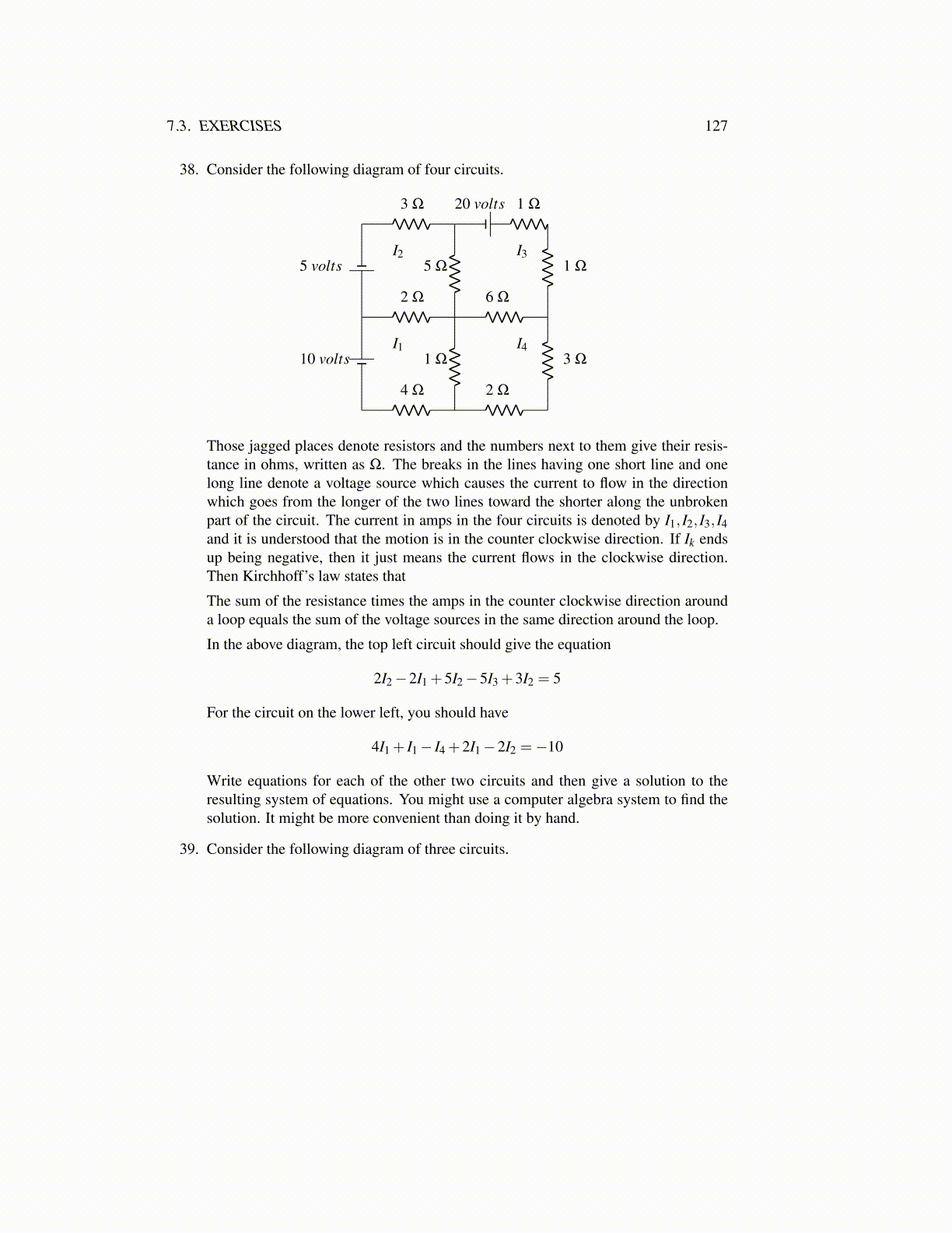 Write equations for each of the other two circuits and then give a solution to theresulting system of equations. You might use a computer algebra system to find thesolution. It might be more convenient than doing it by hand.
