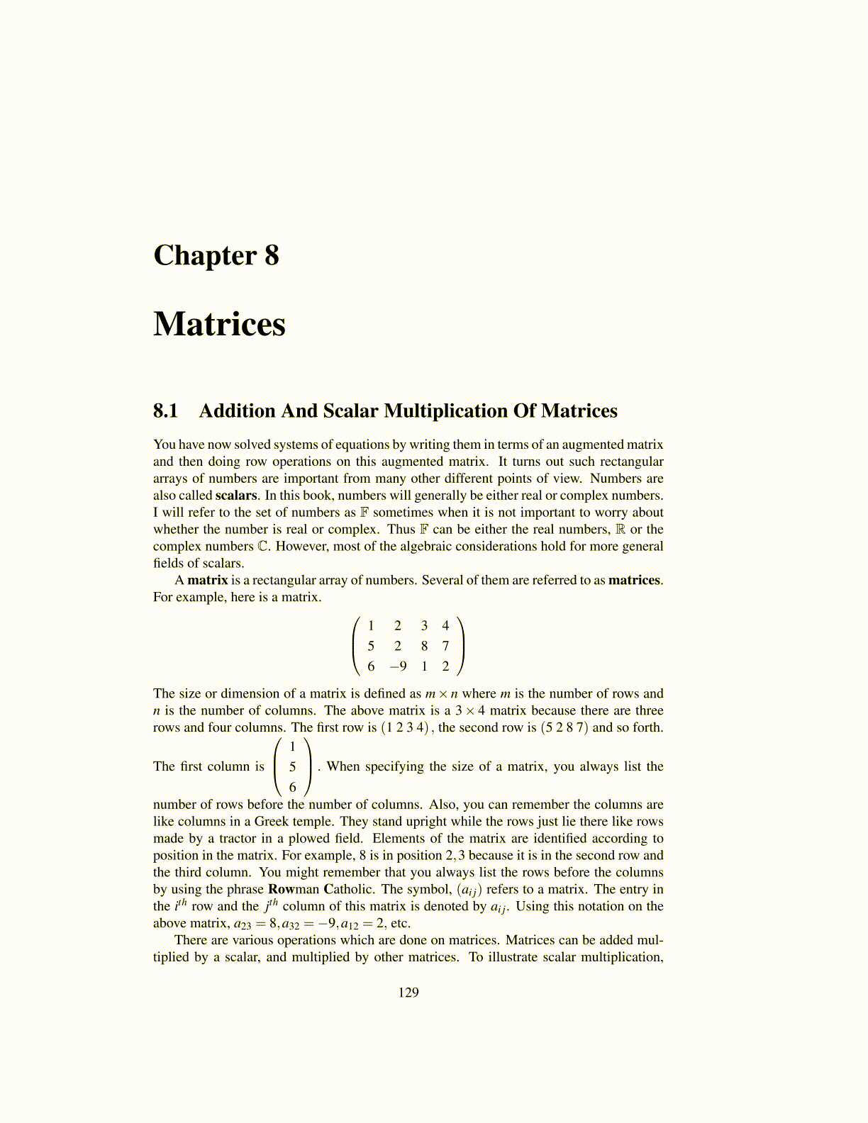 number of rows before the number of columns. Also, you can remember the columns arelike columns in a Greek temple. They stand upright while the rows just lie there like rowsmade by a tractor in a plowed field. Elements of the matrix are identified according toposition in the matrix. For example, 8 is in position 2,3 because it is in the second row andthe third column. You might remember that you always list the rows before the columnsby using the phrase Rowman Catholic. The symbol, (ai j) refers to a matrix. The entry inthe ith row and the jth column of this matrix is denoted by ai j. Using this notation on theabove matrix, a23 = 8,a32 =−9,a12 = 2, etc.