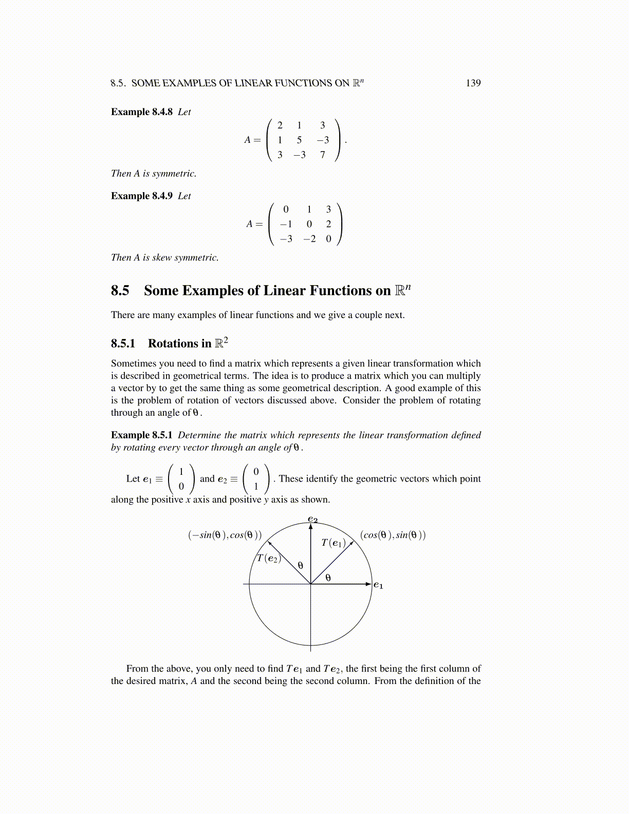 Example 8.5.1 Determine the matrix which represents the linear transformation definedby rotating every vector through an angle of θ .