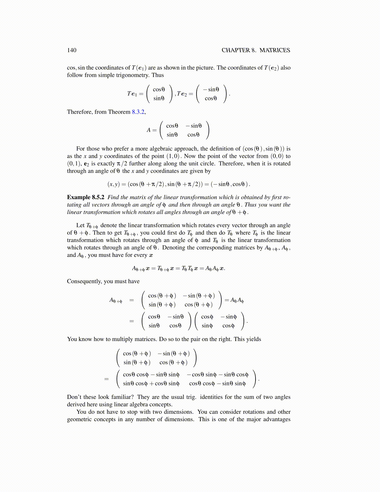 Example 8.5.2 Find the matrix of the linear transformation which is obtained by first ro-tating all vectors through an angle of φ and then through an angle θ . Thus you want thelinear transformation which rotates all angles through an angle of θ +φ .
