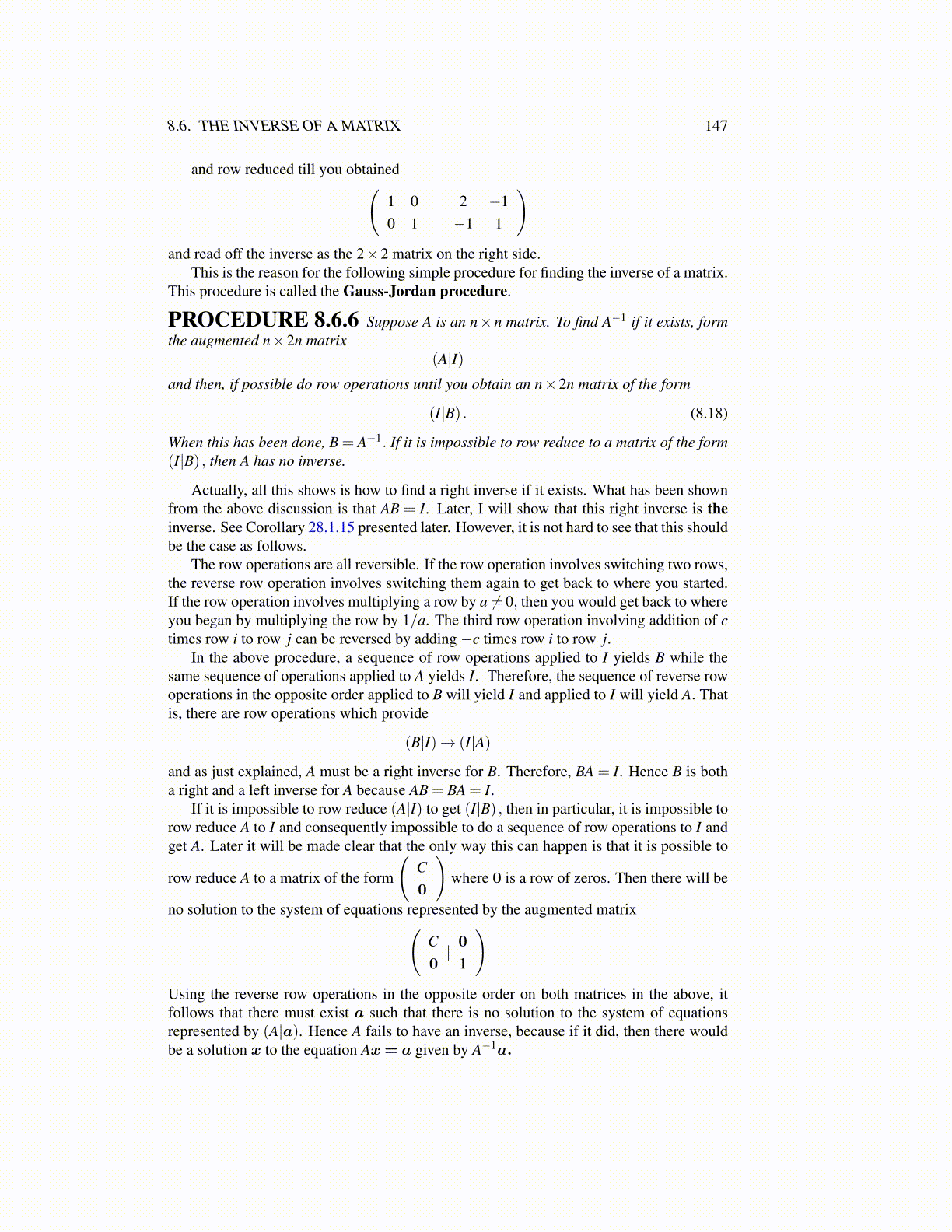 PROCEDURE 8.6.6 Suppose A is an n×n matrix. To find A−1 if it exists, formthe augmented n×2n matrix