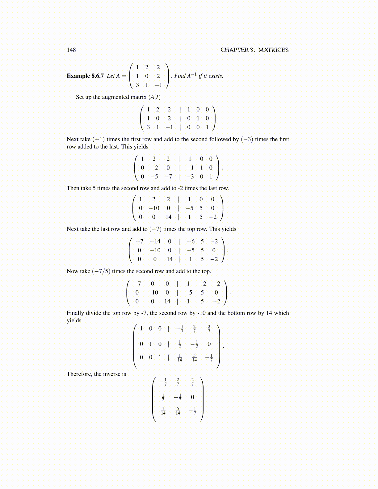 Now take (−7/5) times the second row and add to the top. −7 0 0 | 1 −2 −20 −10 0 | −5 5 00 0 14 | 1 5 −2