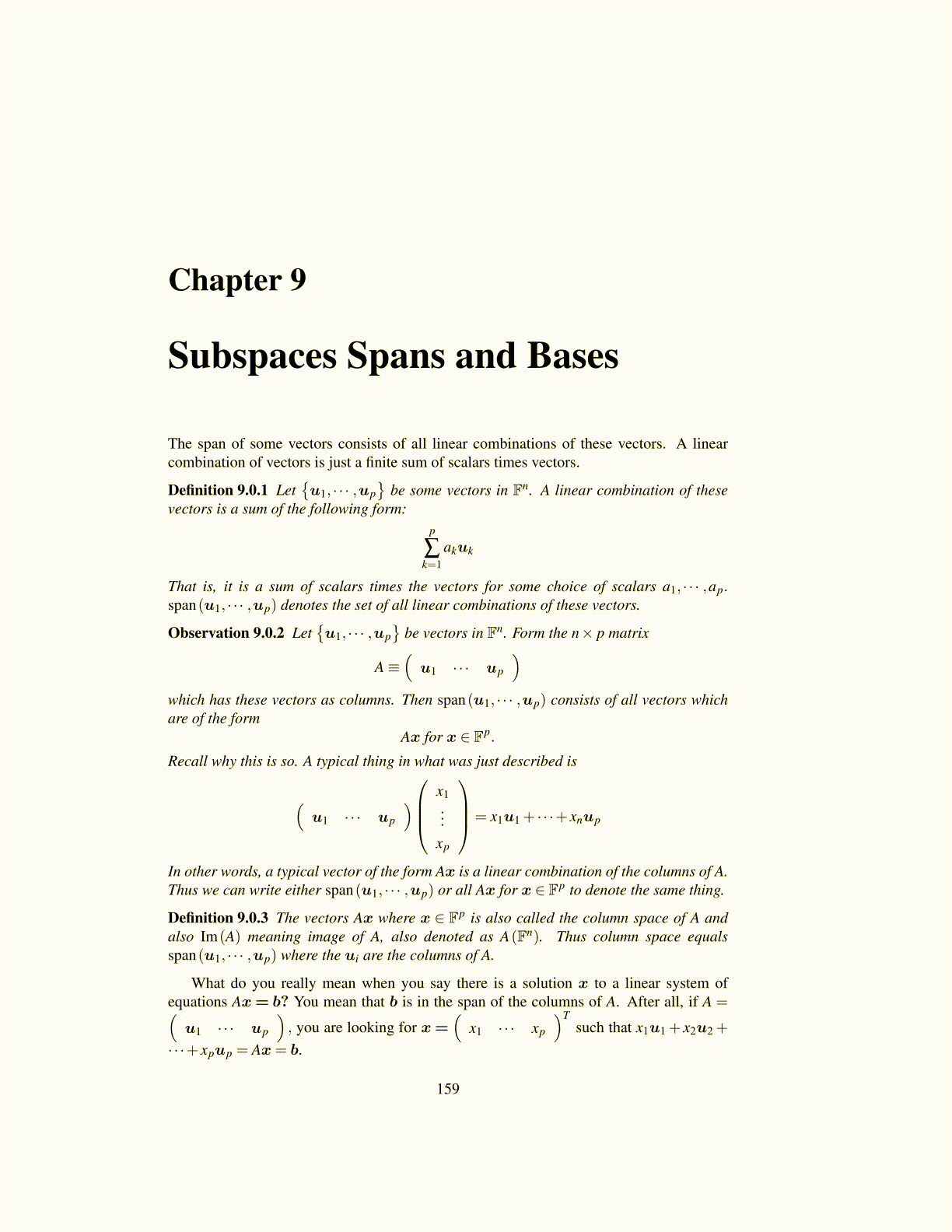 Definition 9.0.3 The vectors Ax where x ∈ Fp is also called the column space of A andalso Im(A) meaning image of A, also denoted as A(Fn). Thus column space equalsspan(u1, · · · ,up) where the ui are the columns of A.