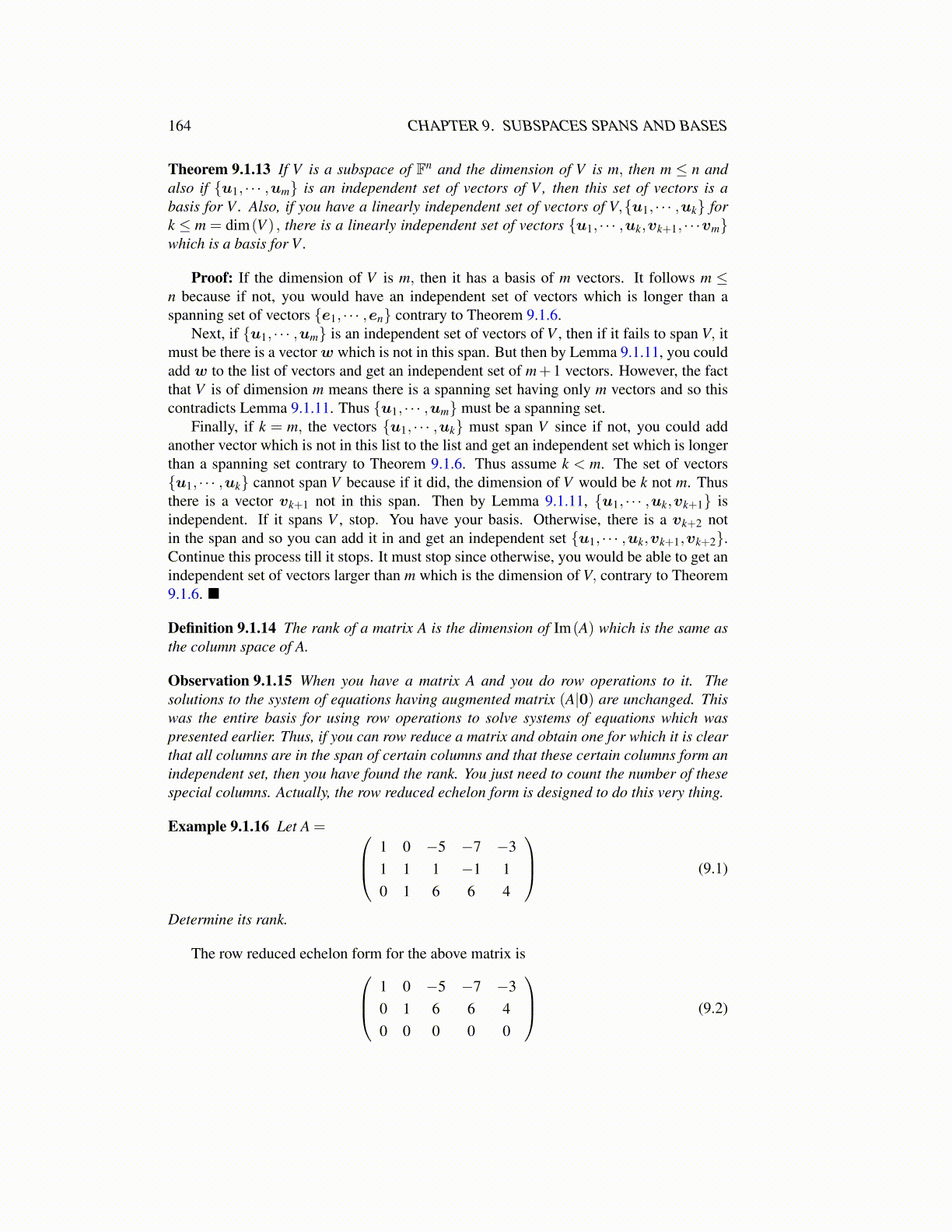 Theorem 9.1.13 If V is a subspace of Fn and the dimension of V is m, then m ≤ n andalso if {u1, · · · ,um} is an independent set of vectors of V , then this set of vectors is abasis for V . Also, if you have a linearly independent set of vectors of V,{u1, · · · ,uk} fork ≤ m = dim(V ) , there is a linearly independent set of vectors {u1, · · · ,uk,vk+1, · · ·vm}which is a basis for V .