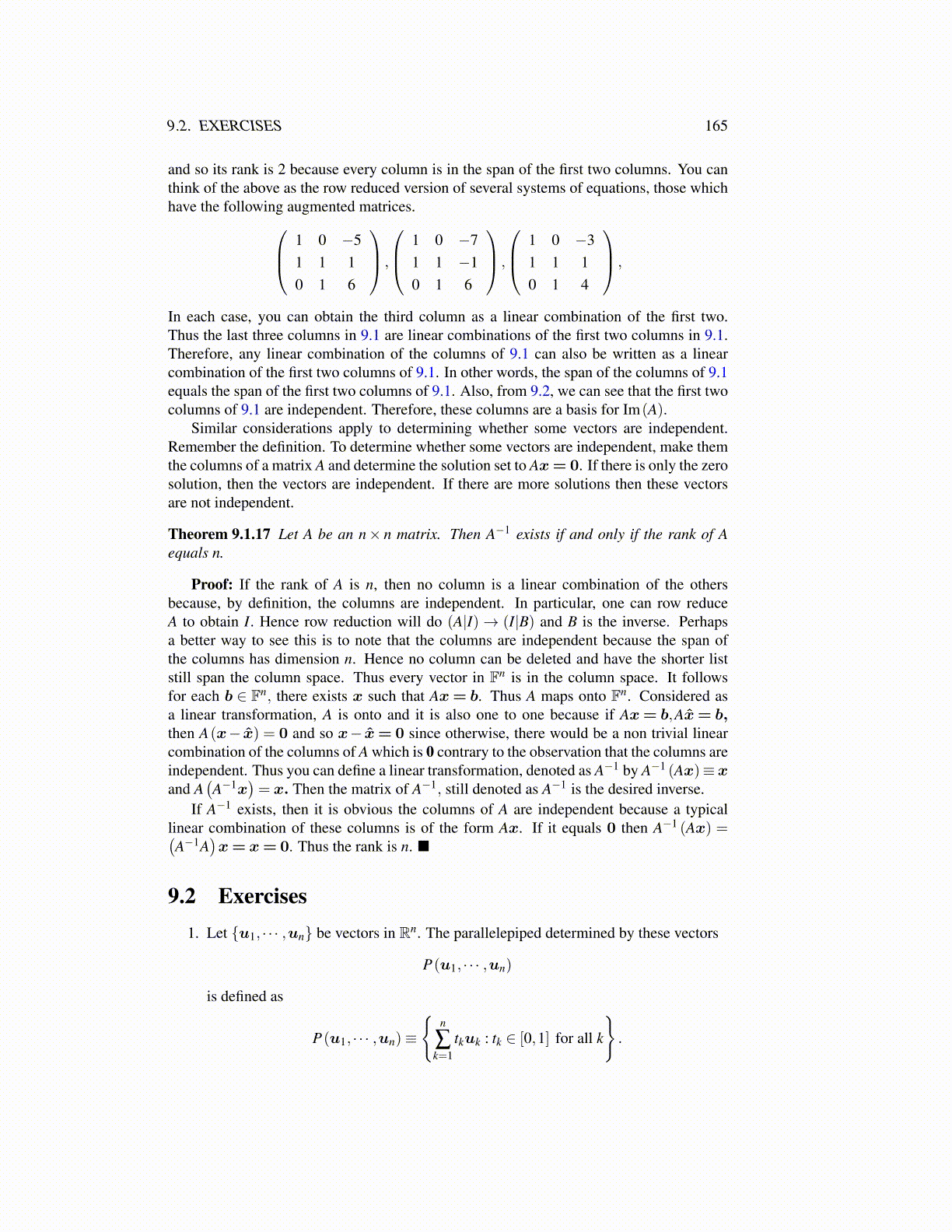 Theorem 9.1.17 Let A be an n× n matrix. Then A−1 exists if and only if the rank of Aequals n.